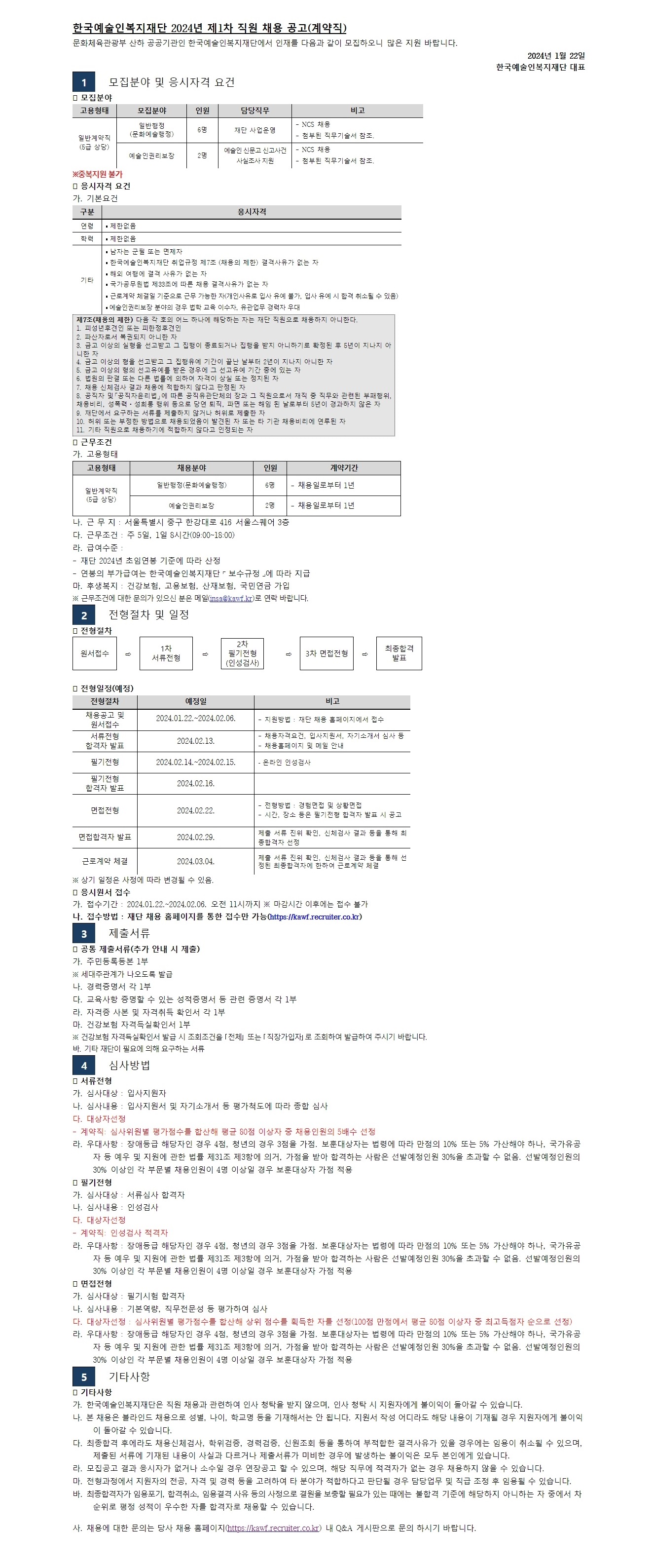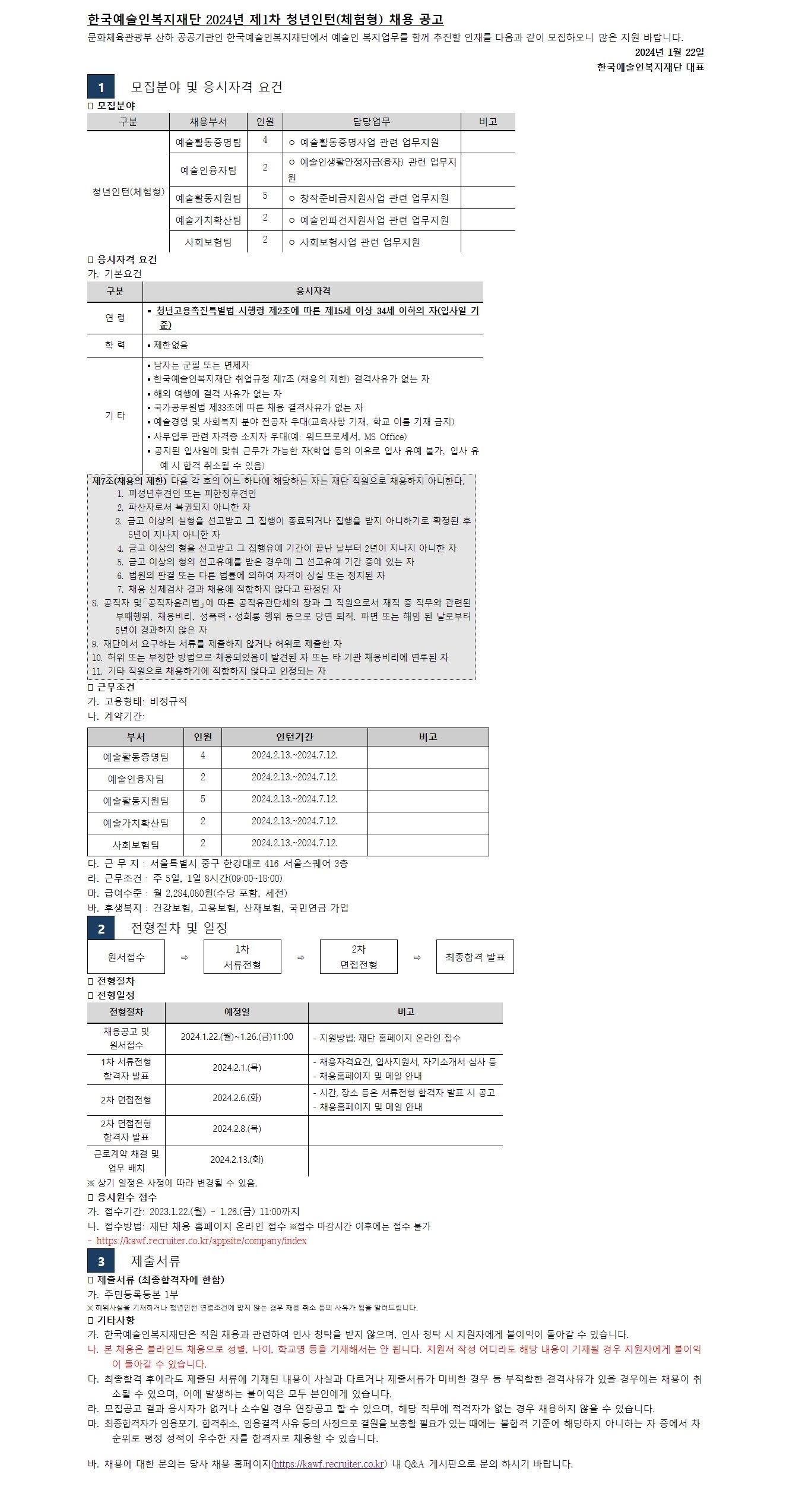 [한국예술인복지재단] 2024년 제1차 직원 채용 공고 (계약직, 체험형인턴)