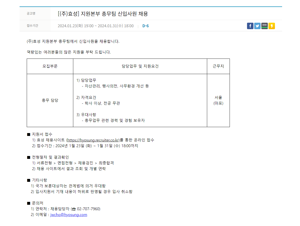 [(주)효성] 지원본부 총무팀 신입사원 채용