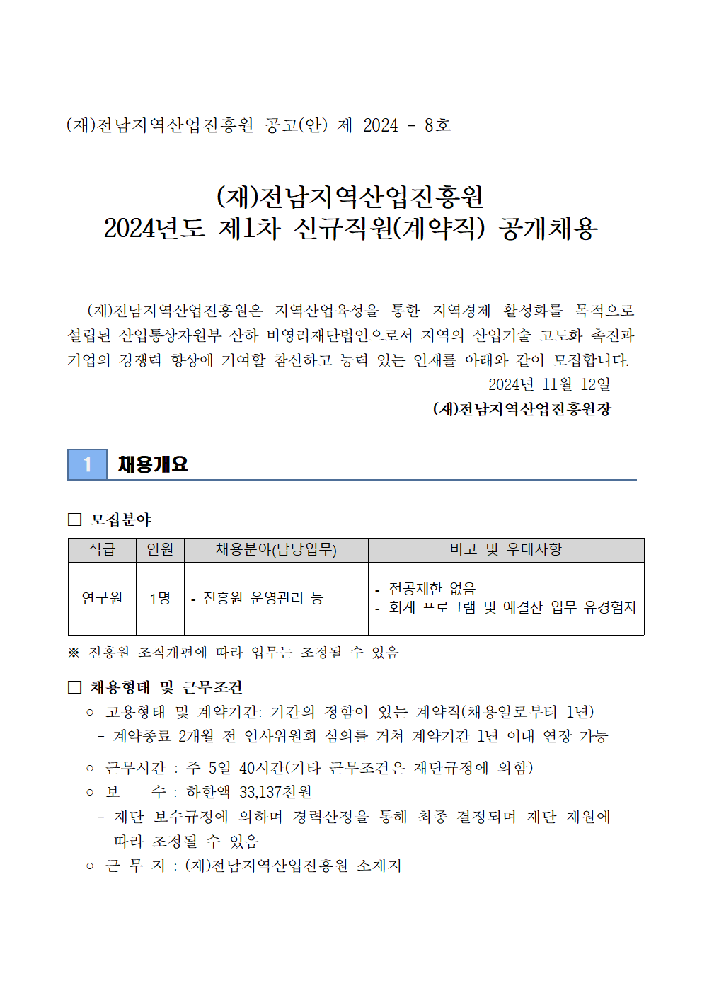 붙임 1. (재)전남지역산업진흥원 2024년 제1차 신규직원 채용 공고.hwp
