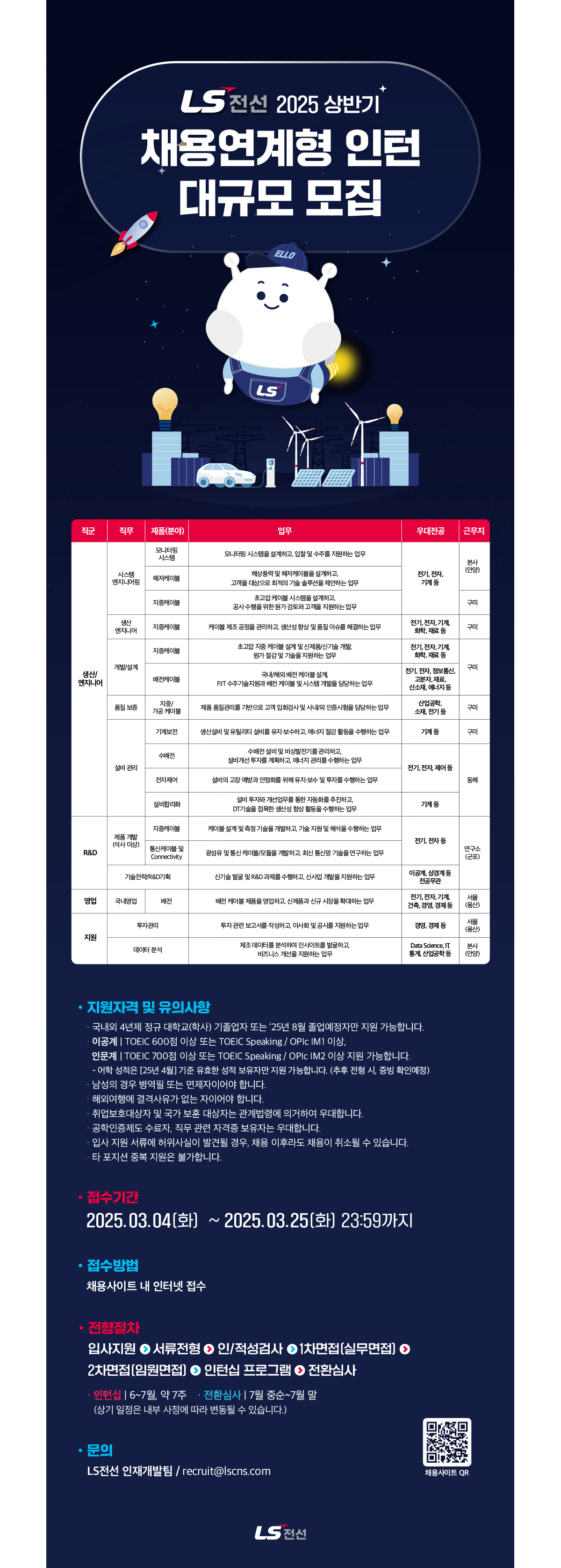 케이블 솔루션 글로벌 리더 LS전선에서 '25년 채용연계형 인턴을 대규모 모집합니다.