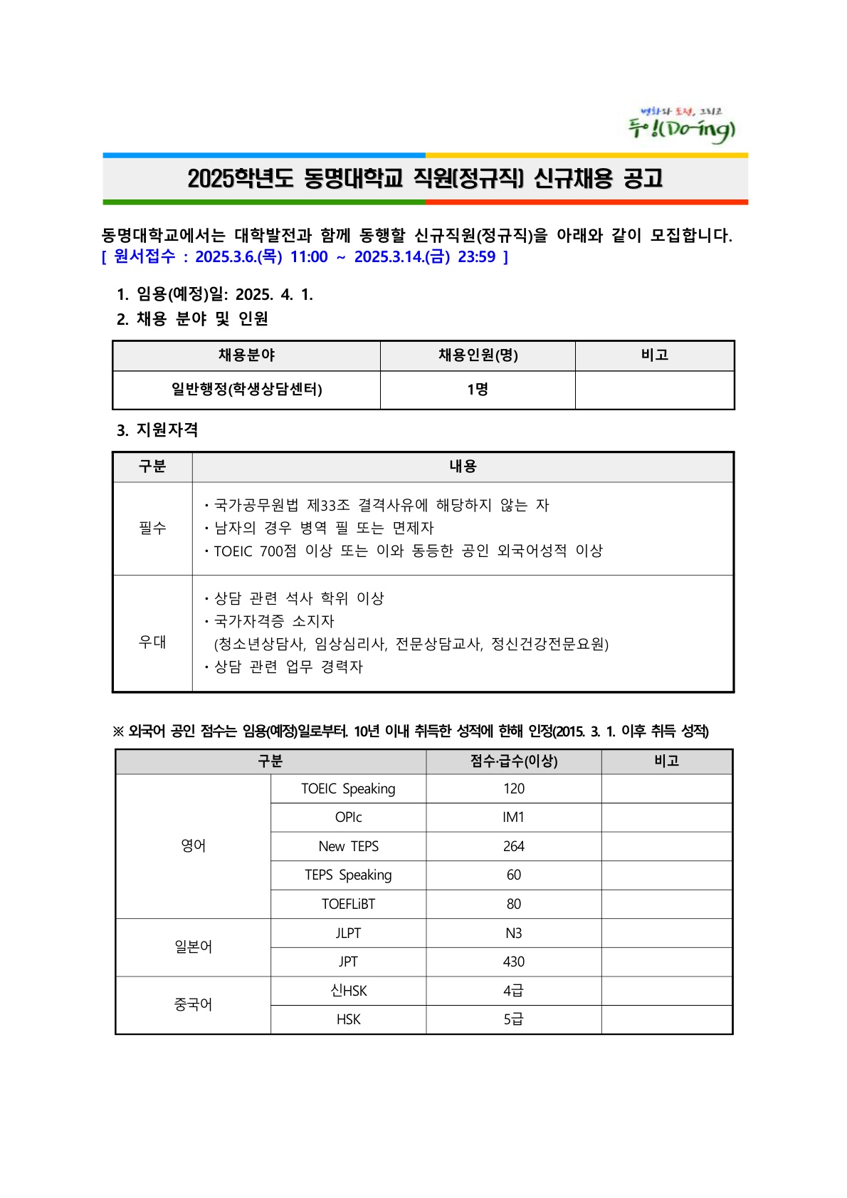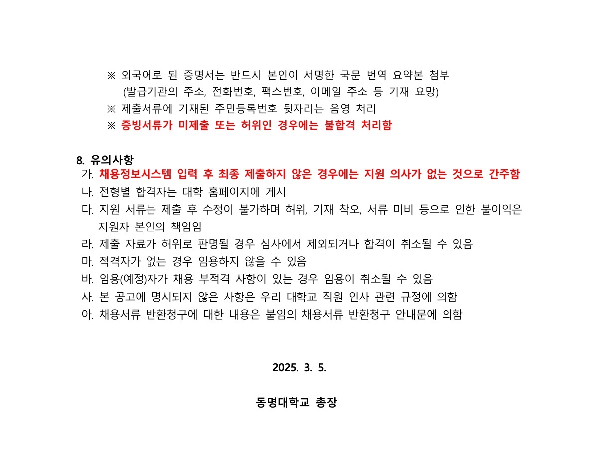 [동명대학교] 2025학년도 직원(정규직) 신규채용 공고