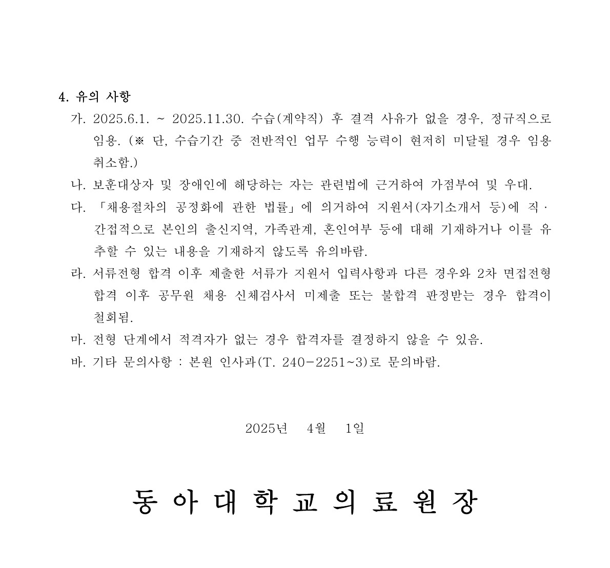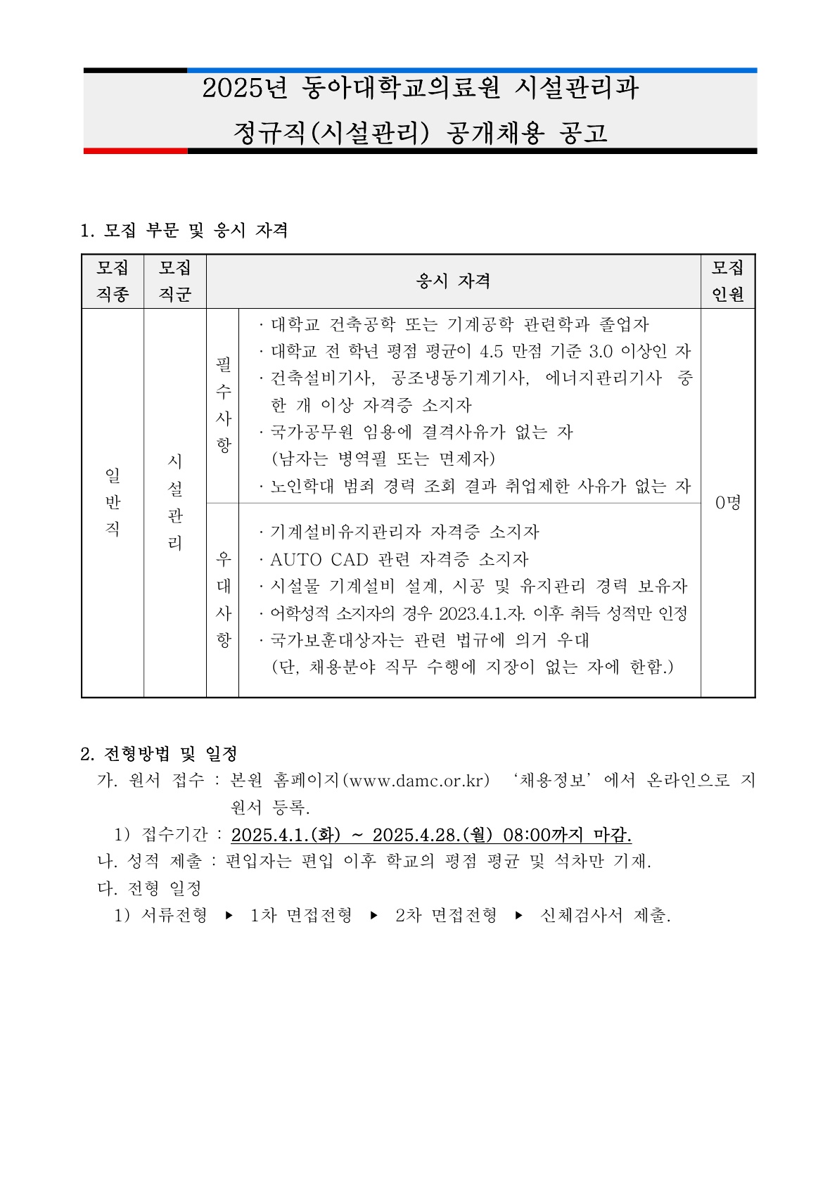 [동아대학교의료원] 2025년 시설관리과 정규직(시설관리) 공개채용 공고