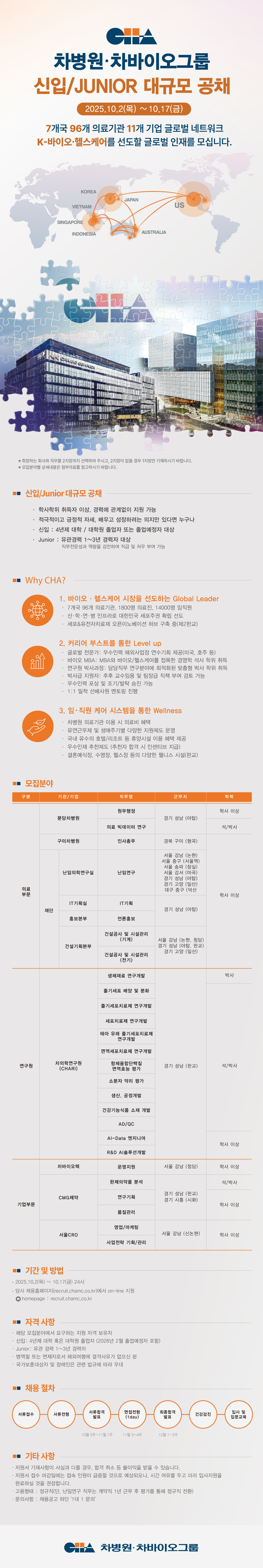 - 고용형태: 정규직(단, 난임연구 직무는 계약직 1년 근무 후 평가를 통해 정규직 전환)