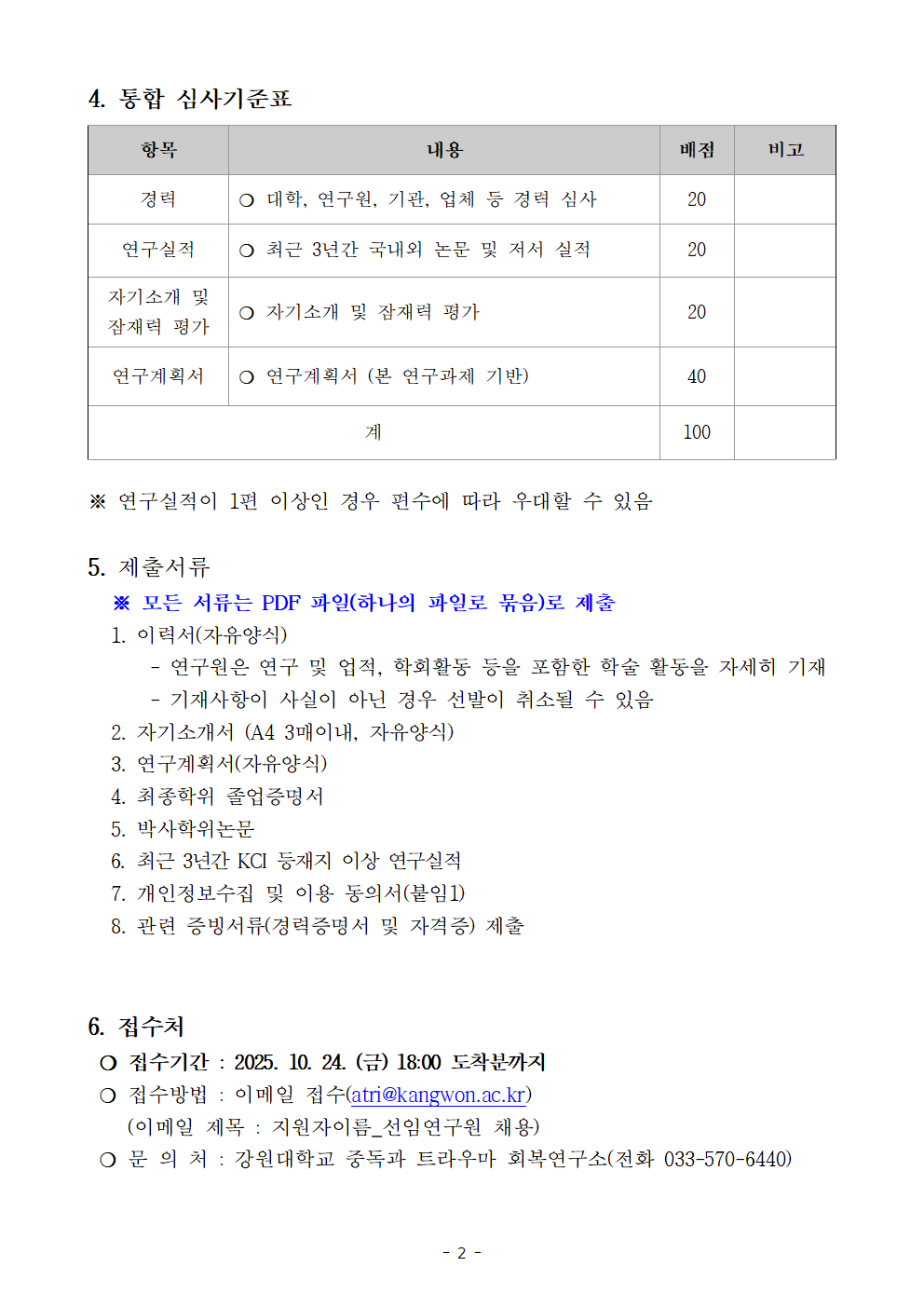 [강원대학교 중독과 트라우마 회복연구소] 선임연구원 공개 채용 공고