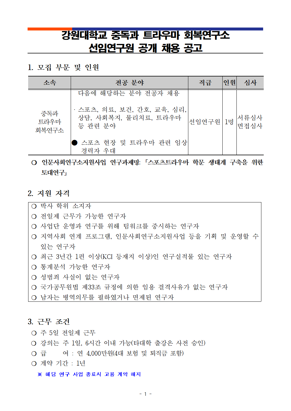 강원대학교 중독과 트라우마 회복연구소 선임연구원 공개 채용 공고.hwp