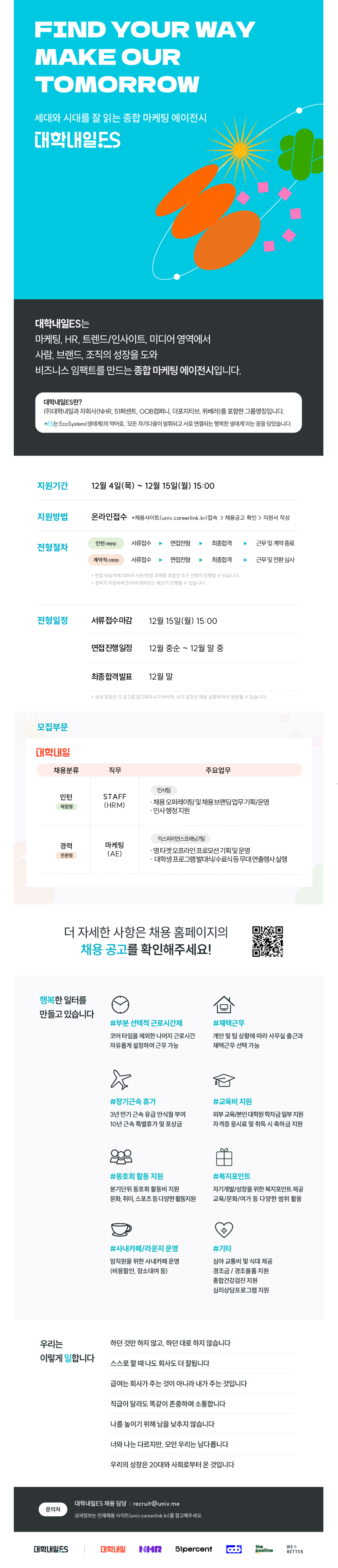 대학내일ES 채용공고 보러가기 : https://univ.careerlink.kr/ 인턴 프로그램 및 동호회 등 대학내일ES 회사생활이 궁금하다면? https://litt.ly/unives
