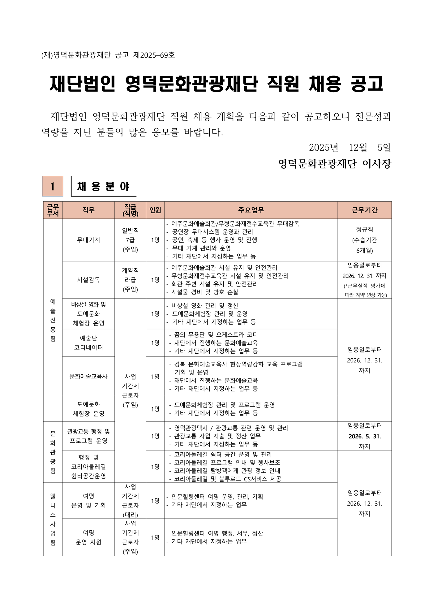 [재단법인 영덕문화관광재단] 2025년 제9차 직원 채용 공고