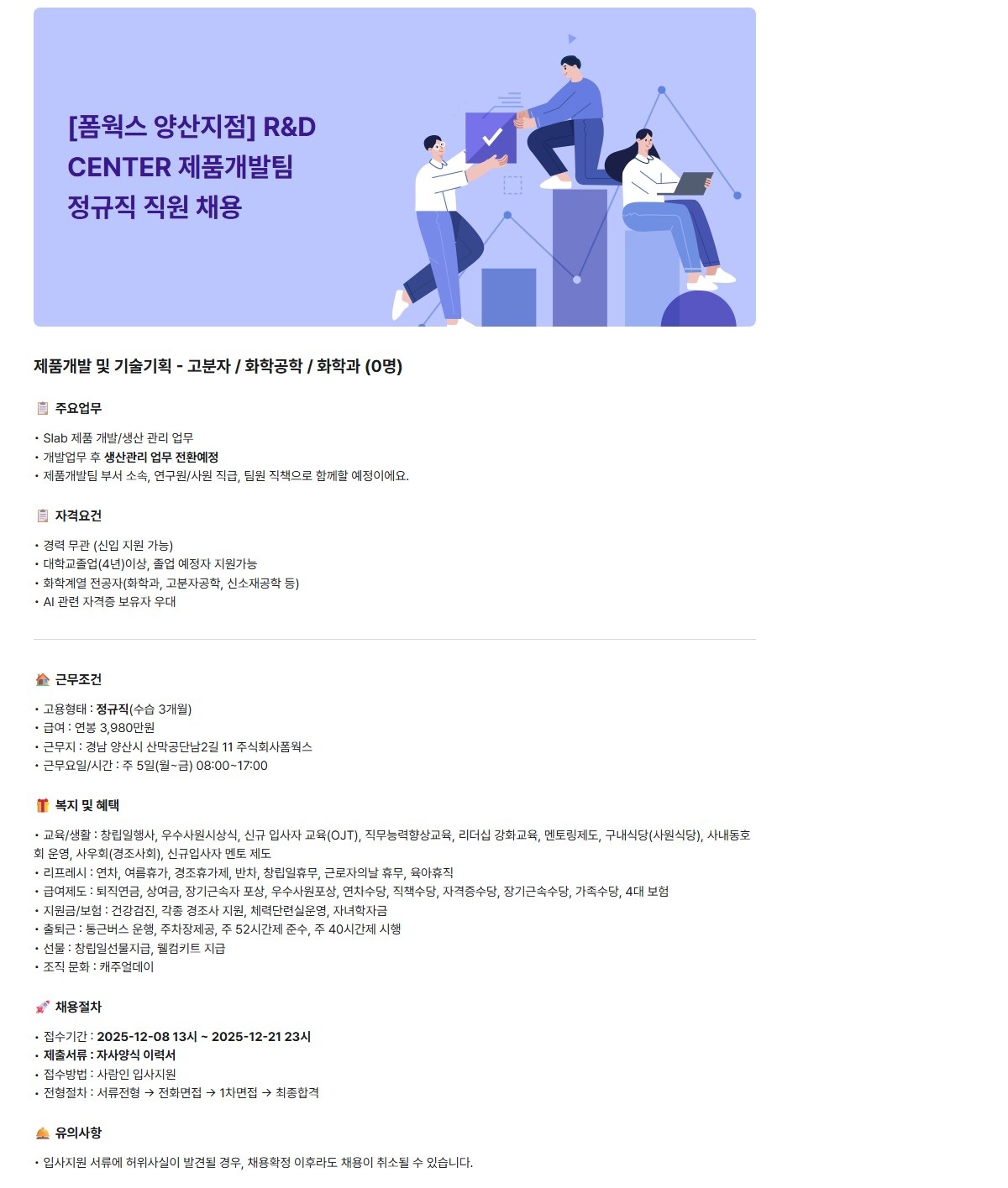 [폼웍스] R&D CENTER 기술기획팀 정규직 직원 채용 (양산)