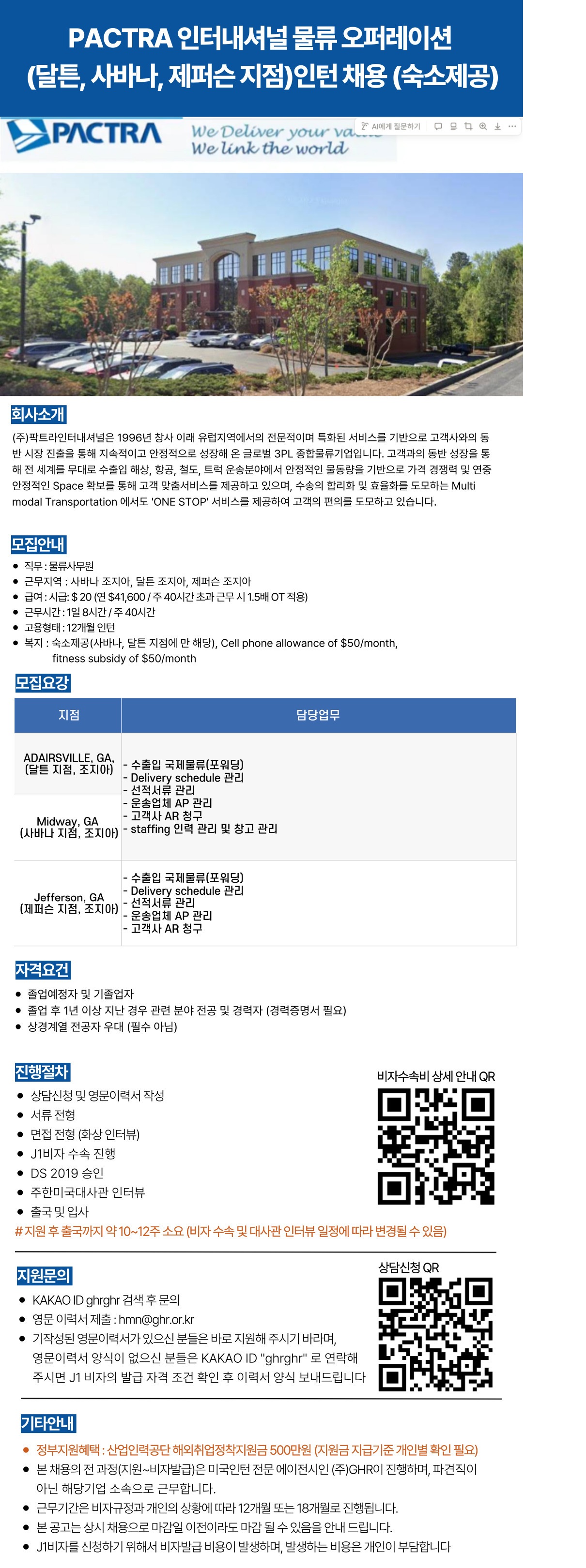 [PACTRA] (해외취업) 인터내셔널 물류 오퍼레이션 지점 인턴 채용 (미국) (GHR)