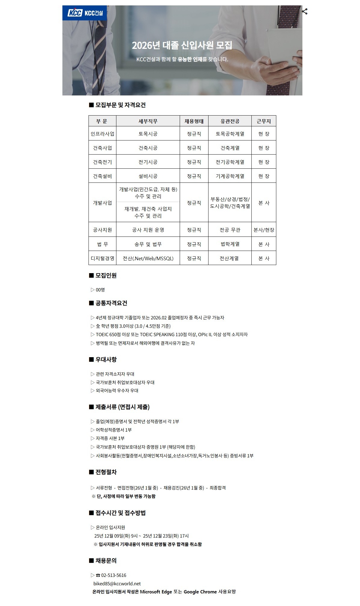 [KCC건설] 2026년 대졸 신입사원 모집