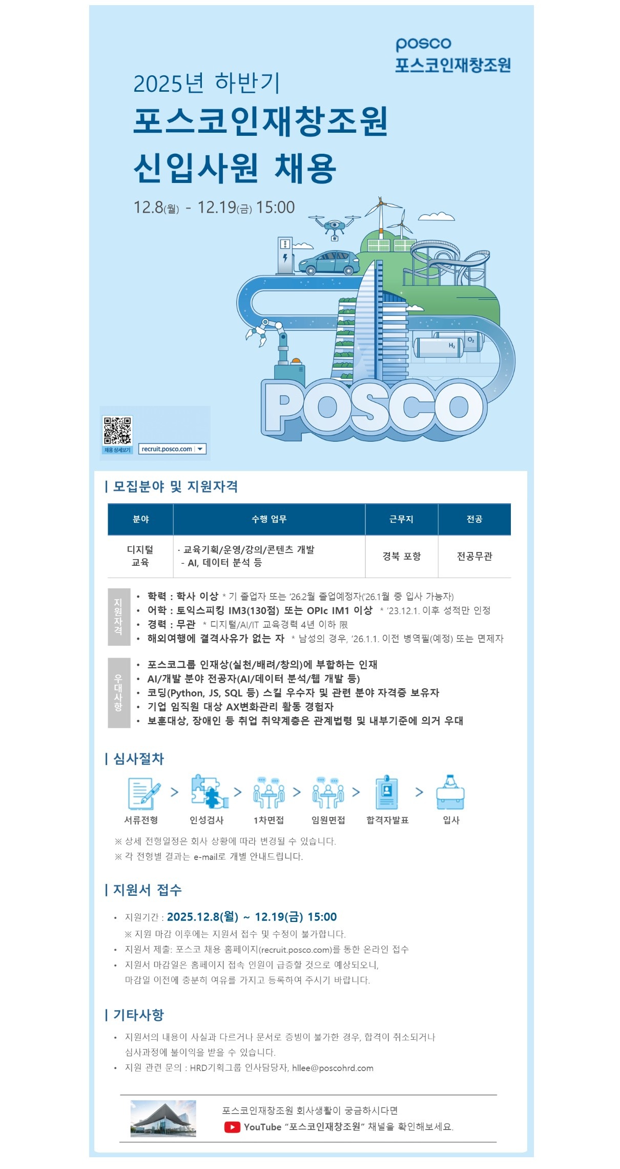 [포스코인재창조원] 2025년 하반기 신입사원 채용(포항)