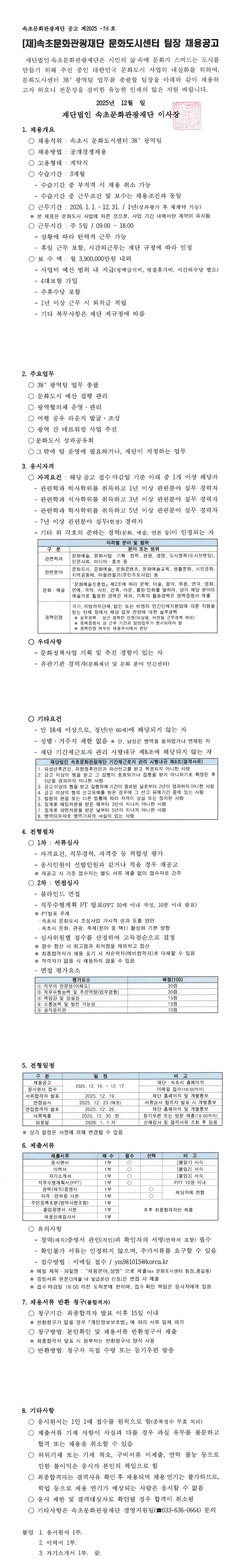 [(재)속초문화관광재단] 문화도시센터 팀장 채용