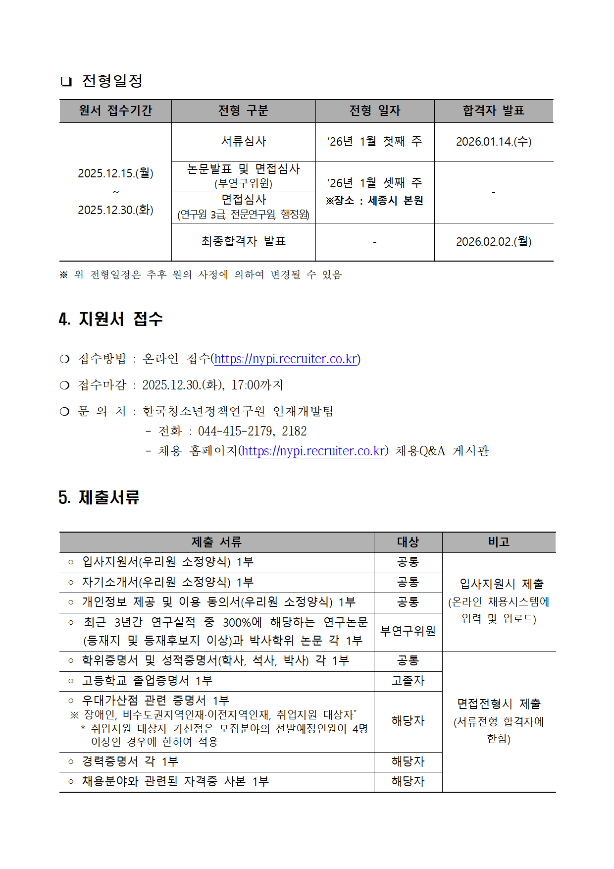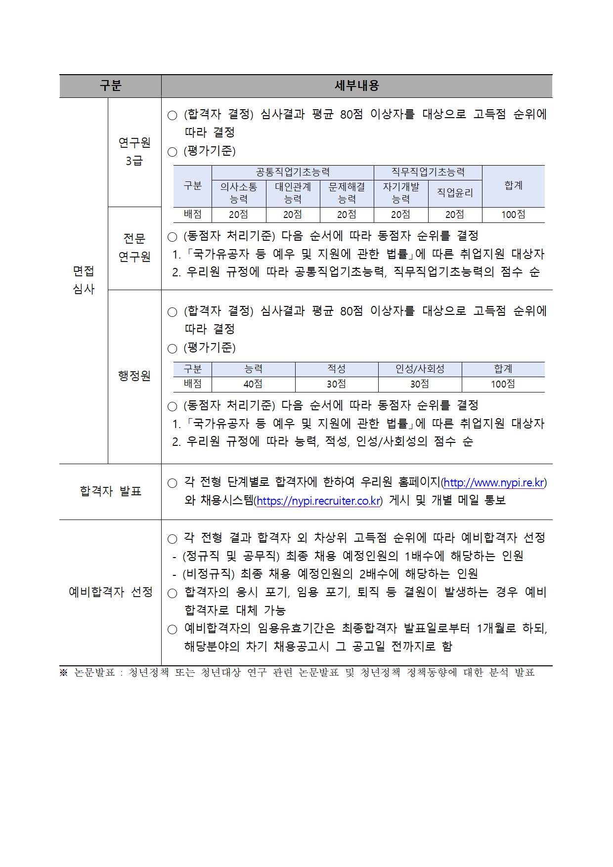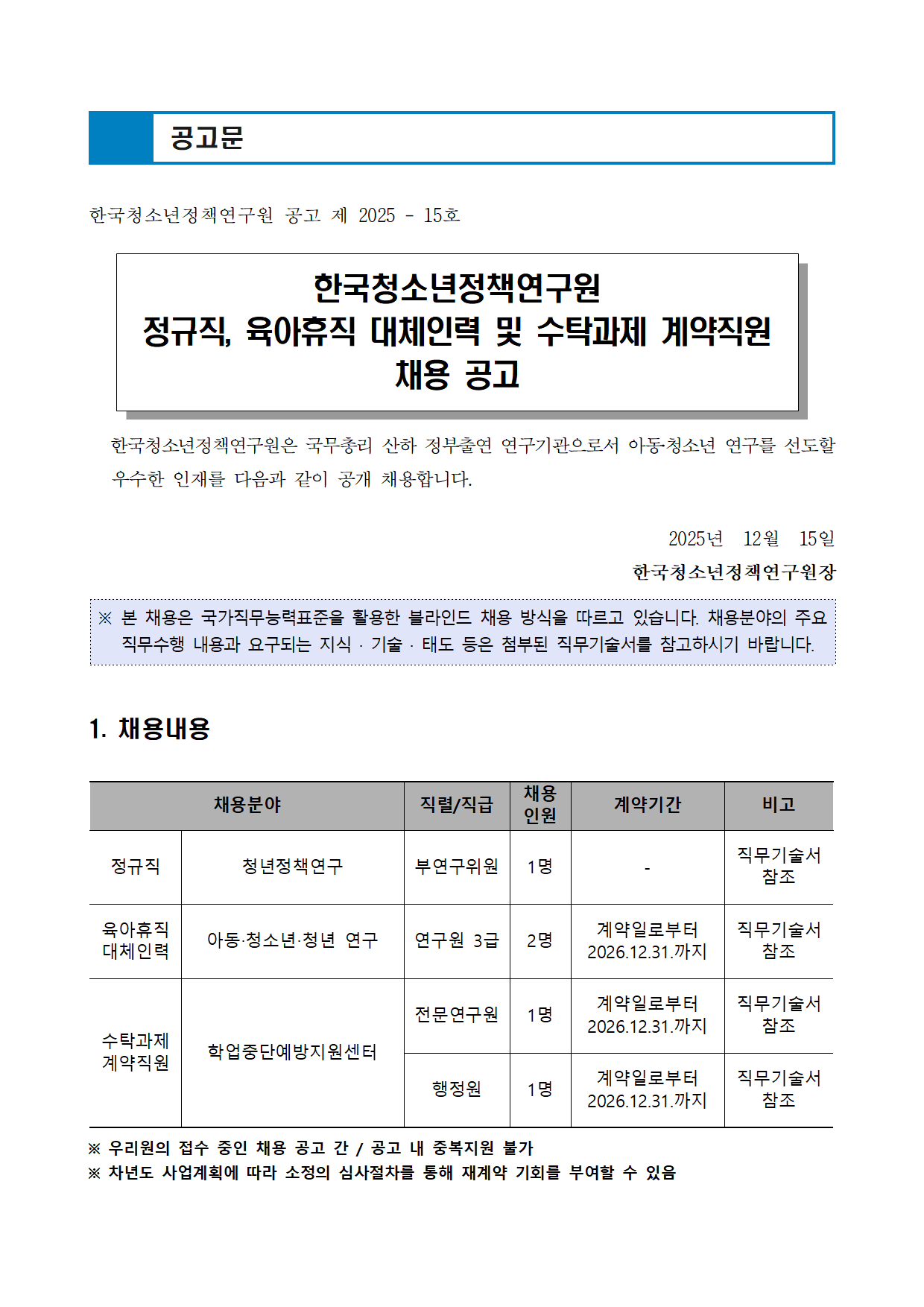 [한국청소년정책연구원] 정규직, 육아휴직 대체인력 및 수탁과제 계약직원 채용 공고