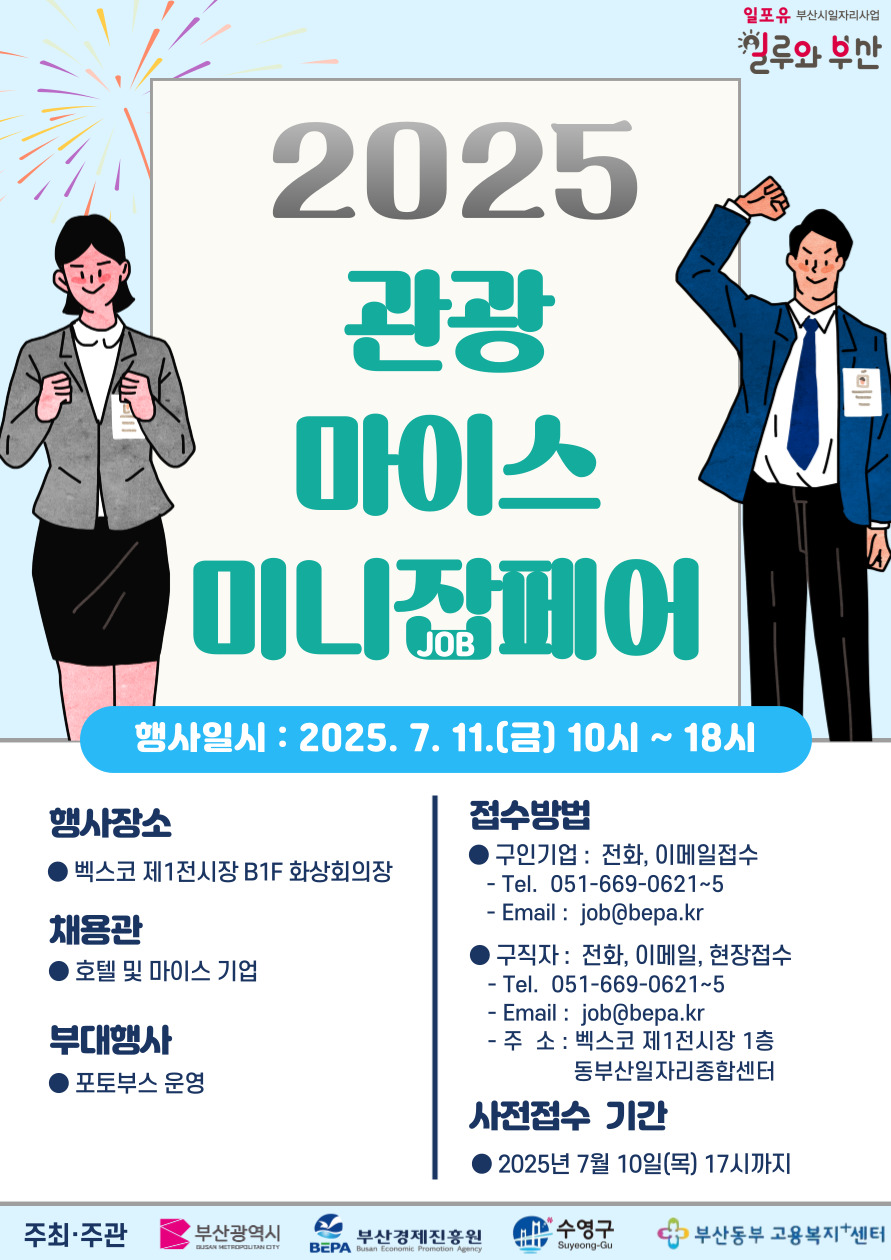 부산지방고용노동청부산동부지청에서는 지역 주요 산업인 관광·마이스 분야 미스매치 해소를 위하여 부산경제진흥원, 수영구청과 공동으로 '2025 관광·마이스 미니 잡(job)페어'를 아래와 같이 개최하니, 관광·마이스 분야에 지원을 희망하는 학생들의 많은 관심 부탁드립니다.