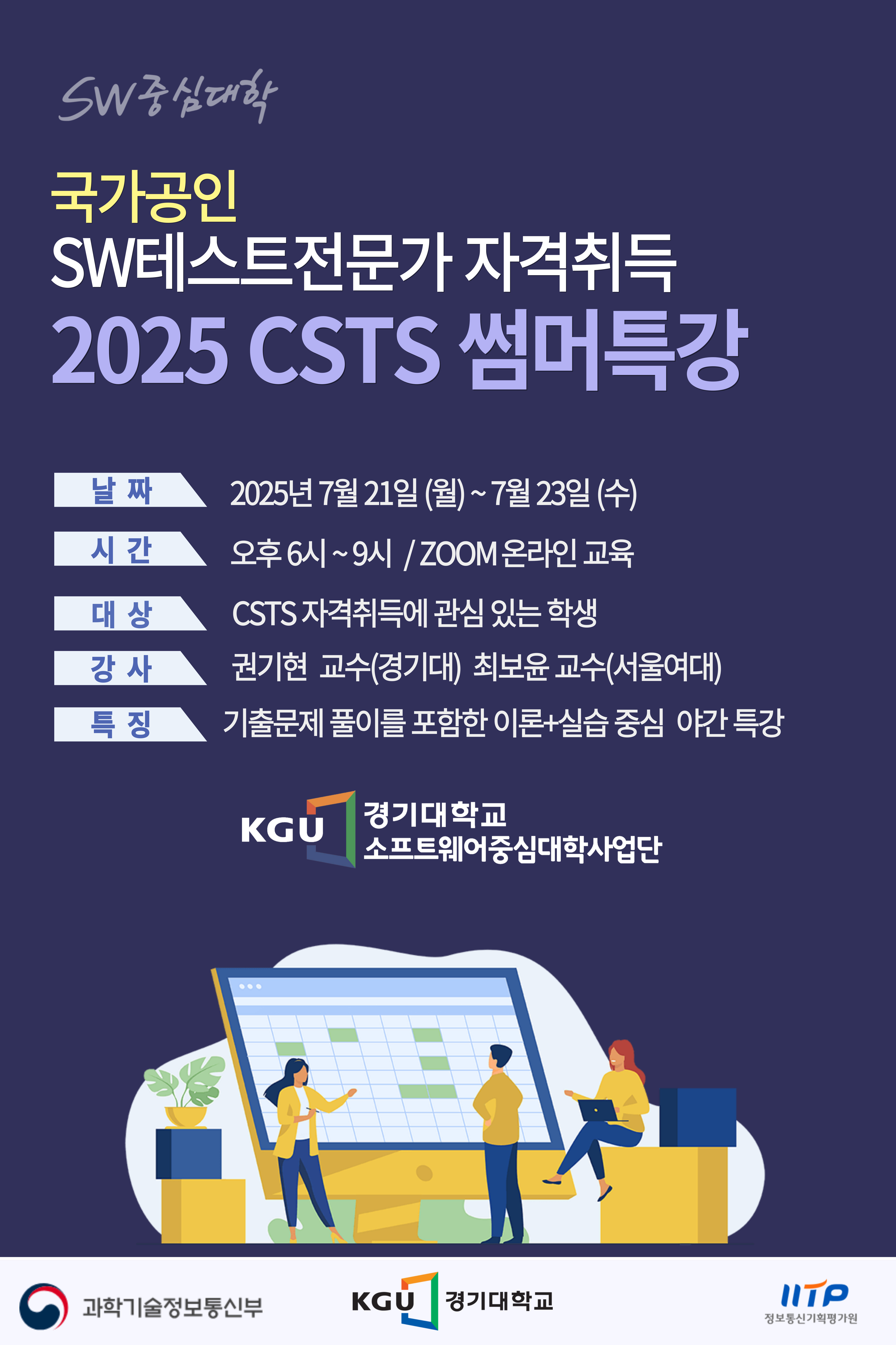 본 사업단에서는 소프트웨어 중심대학사업의 일환으로 재학생들의 소프트웨어 테스트 실무역량 강화 및 csts 자격 취득을 지원하고자, 아래와 같이 「2025년 csts 자격시험 대비 특강」 을 운영하오니, 많은 관심 부탁드립니다.