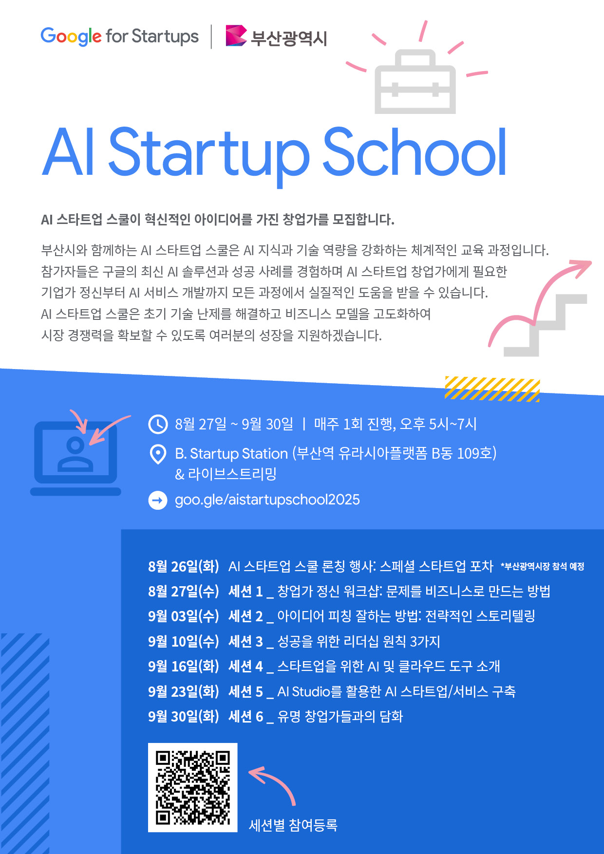 부산시와 구글(google for startups)의 협력으로 운영하는 「스타트업 스쿨」이 오는 8월 27일부터 6주간 ai 특화 콘텐츠로 진행됩니다.