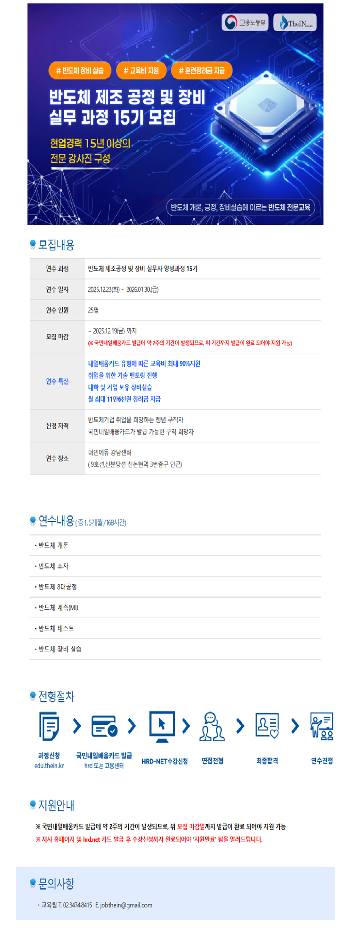- 모집기간 : 2025년 12월19일(금) 까지 ( 조기종료될 수 있습니다. )- 연수과정 : 반도체 제조공정 및 장비실무자 양성과정 15기- 연수대상 : 반도체기업 취업을 희망하는 청년구직자 *국민내일배움카드 발급 가능한 구직희망자 ( 고용노동부에서 자격 및 방법 확인가능 )