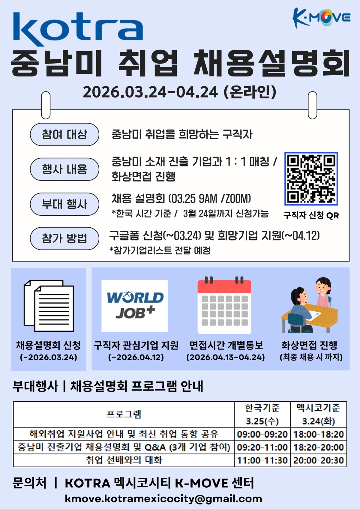 < 2026 중남미 취업 채용설명회 > *구직자대상 안내ㅇ 일시 : 2026.03.24 - 04.24ㅇ 행사내용 : 한국인 구직자 모집 / 기업–구직자 1:1 매칭 및 면접 지원ㅇ 참여방법 : 구글폼 신청(하단 링크참조) https://forms.gle/dWxdALKu16E32EtF8ㅇ 부대행사 : 취업 채용설명회 (3월 24일 오후 6시 / 온라인(ZOOM) *멕시코시티시간 기준) * 계신 곳과 시차에 유의하시기 바라며, 3월 23일까지 신청해주세요. * 이번 부대행사는 기업 담당자 분들과 직접 소통 하실 수 있도록 준비하였습니다. 신청서 내 사전 질문란에 궁금하신 사항을 많이 남겨주시기 바랍니다.ㅇ 문의처 : kmove.kotramexicocity@gmail.com