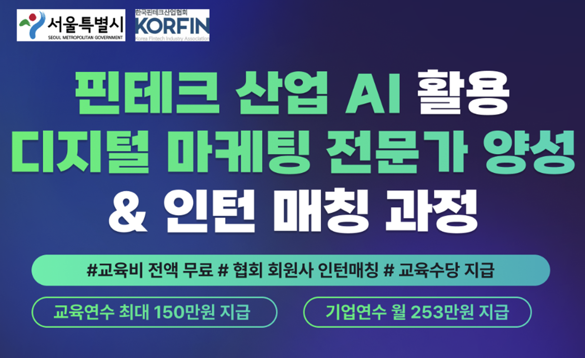 - 모집기간 : 4월 21일(화) 까지 ( 조기 종료될 수 있습니다. )- 연수기간 : 2026년 4월 28일~2026년 7월31일 ( 이후 3개월 인턴쉽진행 )- 연수장소 : 더인에듀 교육센터 ( 강남역, 신논현역 인근 도보5분 )- 지원자격 : 만39세이하 서울시 거주자