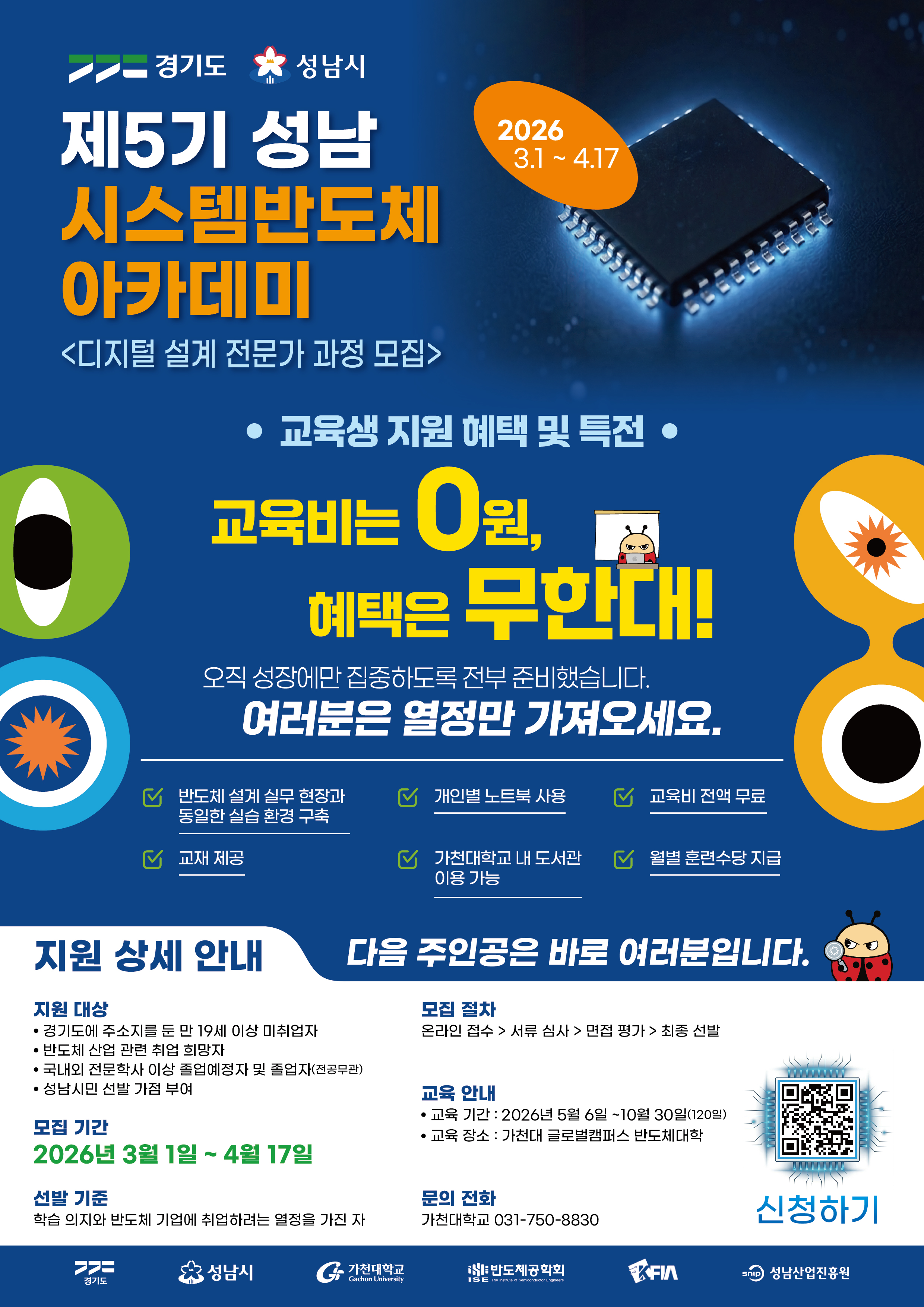 반도체 설계(팹리스) 아카데미를 운영하고 있습니다. 이에 2026년도 교육생을 모집하오니 많은 관심 부탁드립니다.