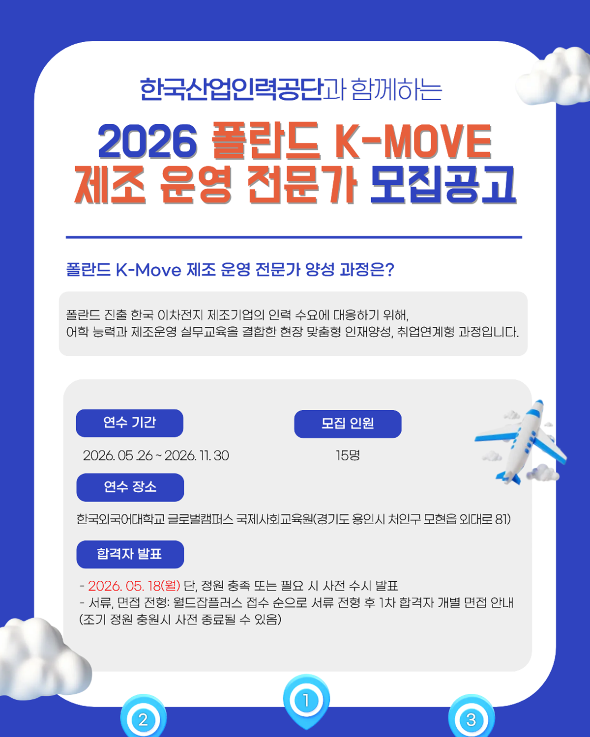 https://www.worldjob.or.kr/advnc/strnLink.do?joCrtfcNo=T20260114028&joCrtfcDsp=1&joCrtfcDspSn=1• 과정명 : 2026 폴란드 제조 운영 전문가 양성과정