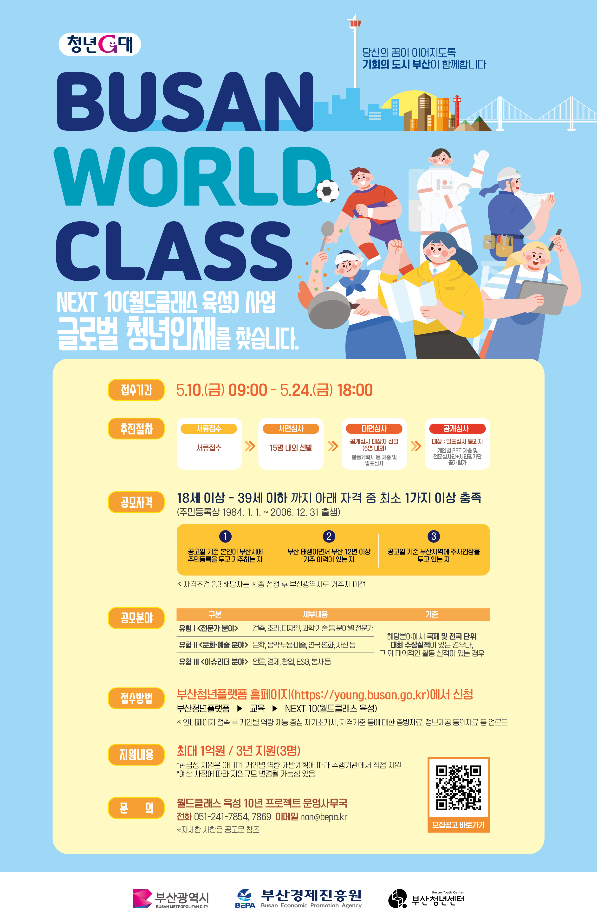 부산시와 부산경제진흥원은 부산 지역 인재를 발굴하여 글로벌 리더로 성장·도약할 수 있도록 지원하는 ‘2024 NEXT10(월드클래스 육성)사업’에 참여할 우수한 청년인재를 모집하고 있습니다.
