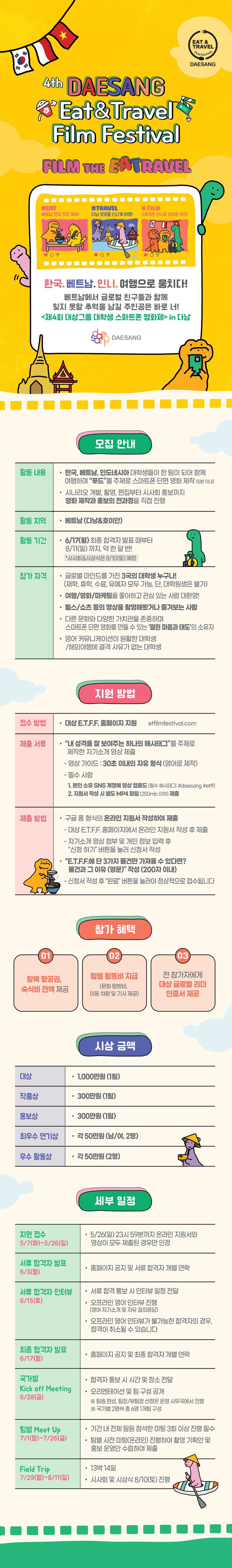 - 한국, 베트남, 인도네시아 대학생들이 한 팀이 되어 함께 여행하며 “푸드”를 주제로 스마트폰 단편 영화 제작 (5분 이내)