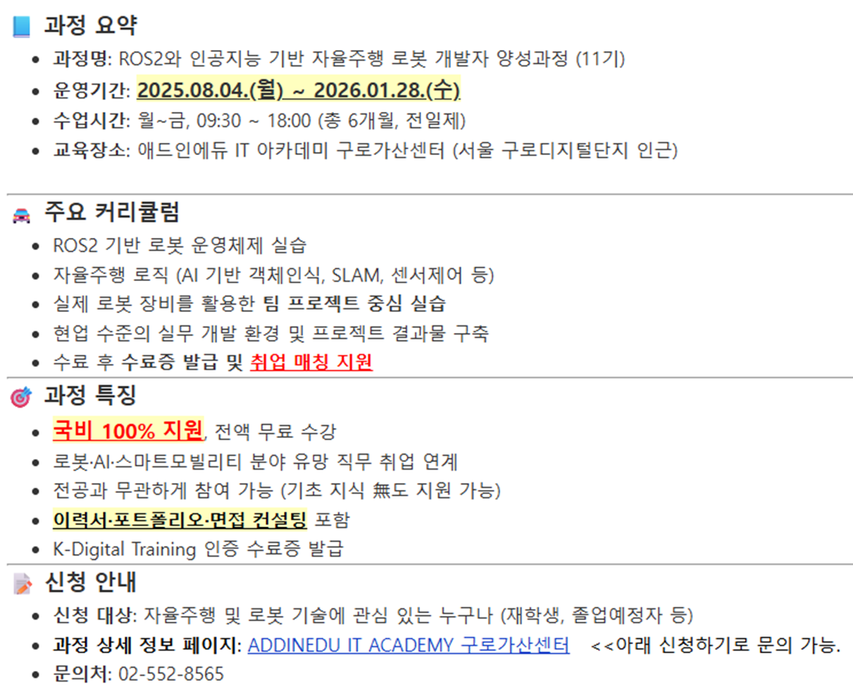 [애드인에듀IT아카데미] (비전공자 가능) 국비무료 ROS2·AI 자율주행 로봇 개발자 교육 참여 11기 훈련생 모집
