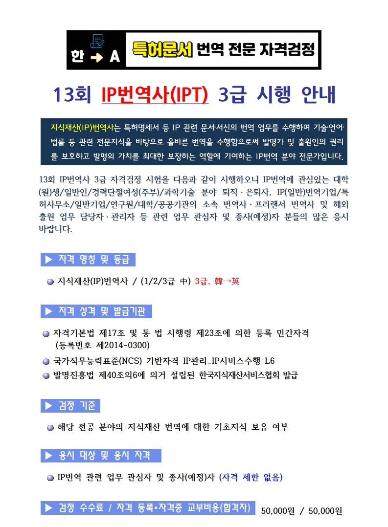 (특허 번역 전문) 13회 IP번역사 3급 자격검정 안내(~5/10)