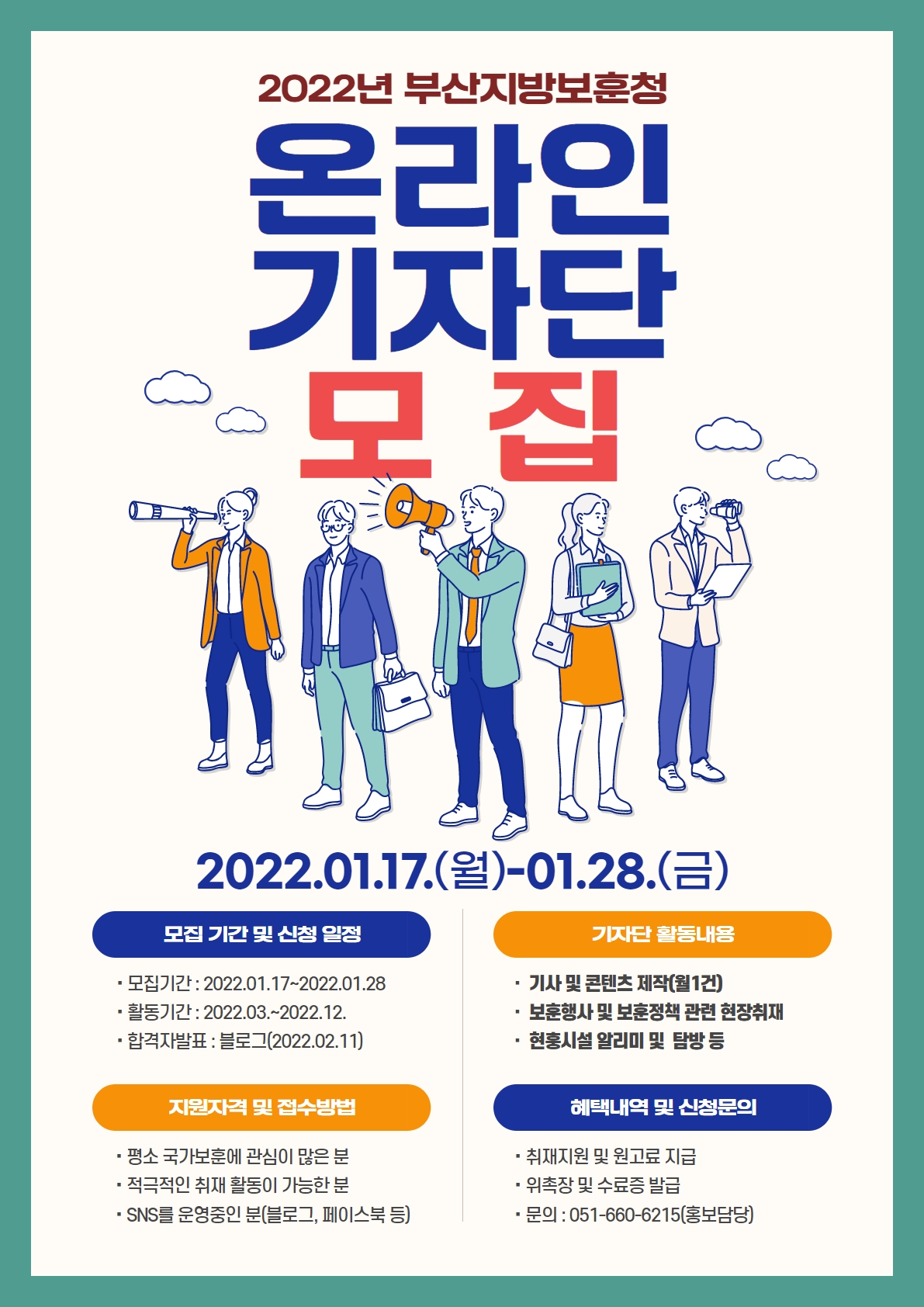 우리청에서는 든든한 보훈을 알릴 열정 가득한 대학(원)생을 대상으로 2022년 온라인기자단을 모집하고 있습니다.