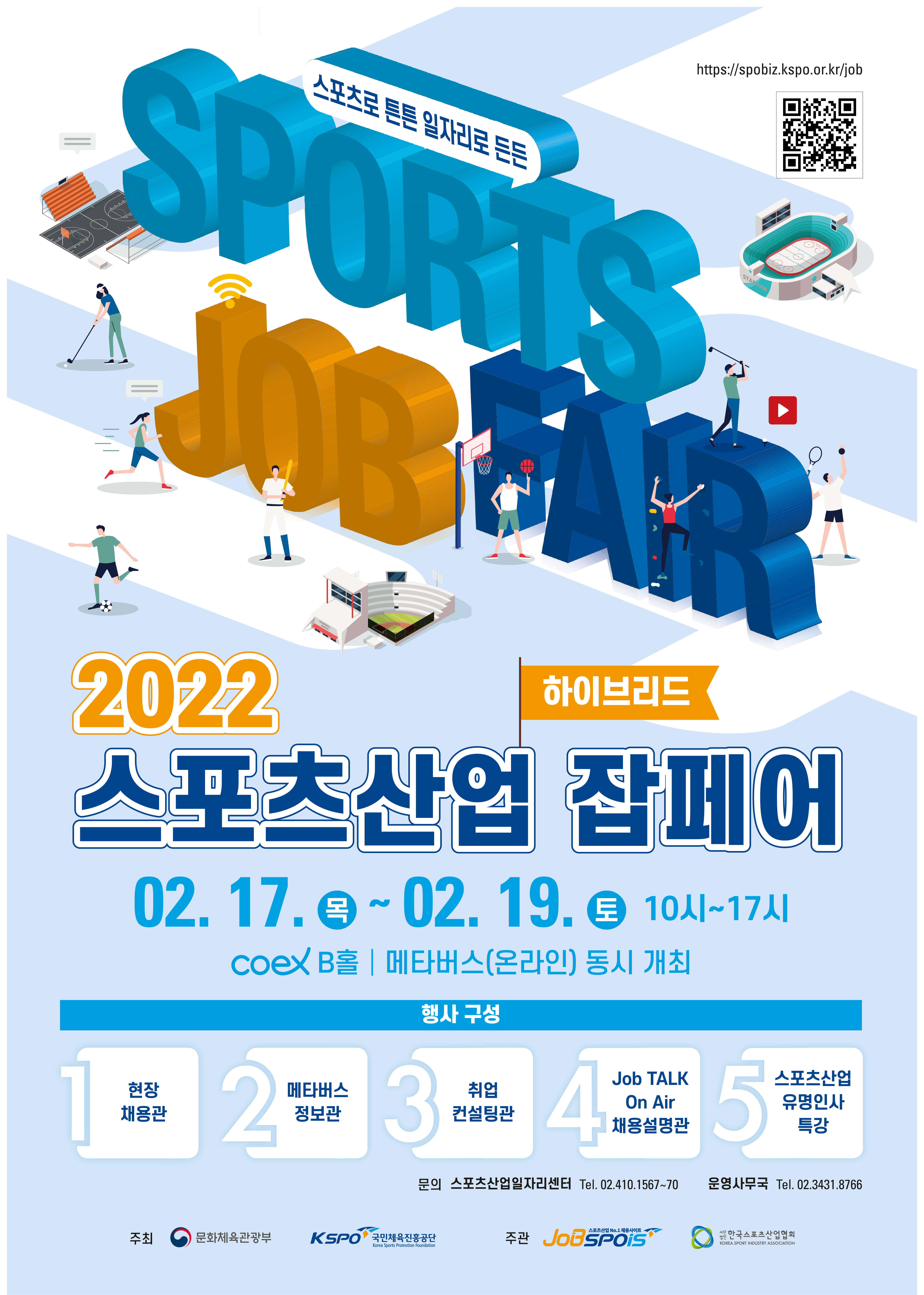 문화체육관광부와 국민체육진흥공단은 스포츠산업분야 취업을 희망하는 구직자를 대상으로 우수한 스포츠기업과의 일자리 매칭을 통한 일자리 창출을 위해 아래와 같이 ‘2022 하이브리드(온?오프라인) 스포츠산업 잡페어(JOB FAIR)’를 개최하오니 관심있는 분들의 많은 참여 바랍니다.