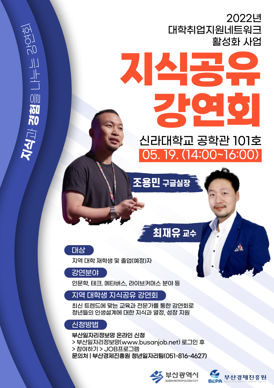 대학생 지식공유 강연회 (1차) | 5.19.(월) 14:00~16:30 | 명사특강 1:조용민 이사 (구글) “4차 산업혁명의 시대 자신을 혁신하는 방법” 명사특강 2: 최재유 교수 ( 디지털엔터테인먼트) “디지털 엔터테인먼트의 AI와 기업목표 가지기” | 구 글 디지털엔터테인먼트 |