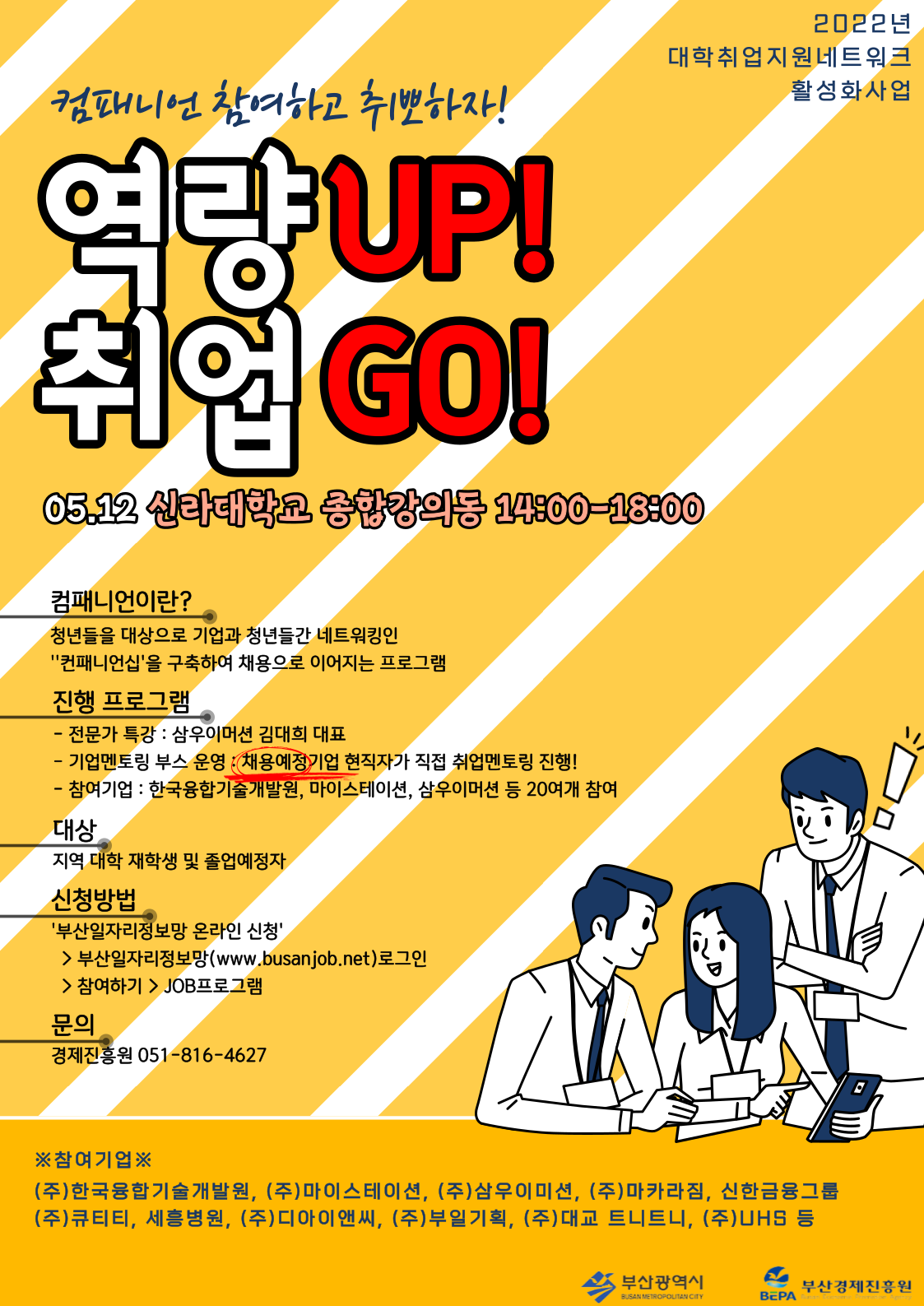 지역주력산업-대학 컴패니언십 구축사업 (1차) | 5.12.(목), 14:00~18:00 | 기업특강 : ㈜삼우이머션 김대희 대표 “메타버스시대, 우리는 이런인재를 원한다!” 기업멘토링 부스운영 : 기업 현직자 취업관련 멘토링 | ㈜한국융합기술개발원, 마이스테이션, 신한라이프, 세흥병원 등 20여개사 |