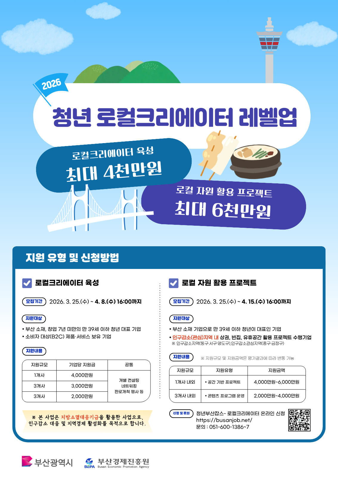 부산광역시와 부산경제진흥원은 지방소멸대응기금을 활용해 인구감소 대응 및 지역경제 활성화를 목적으로 「청년 로컬크리에이터 레벨업 사업」을 추진 중입니다.