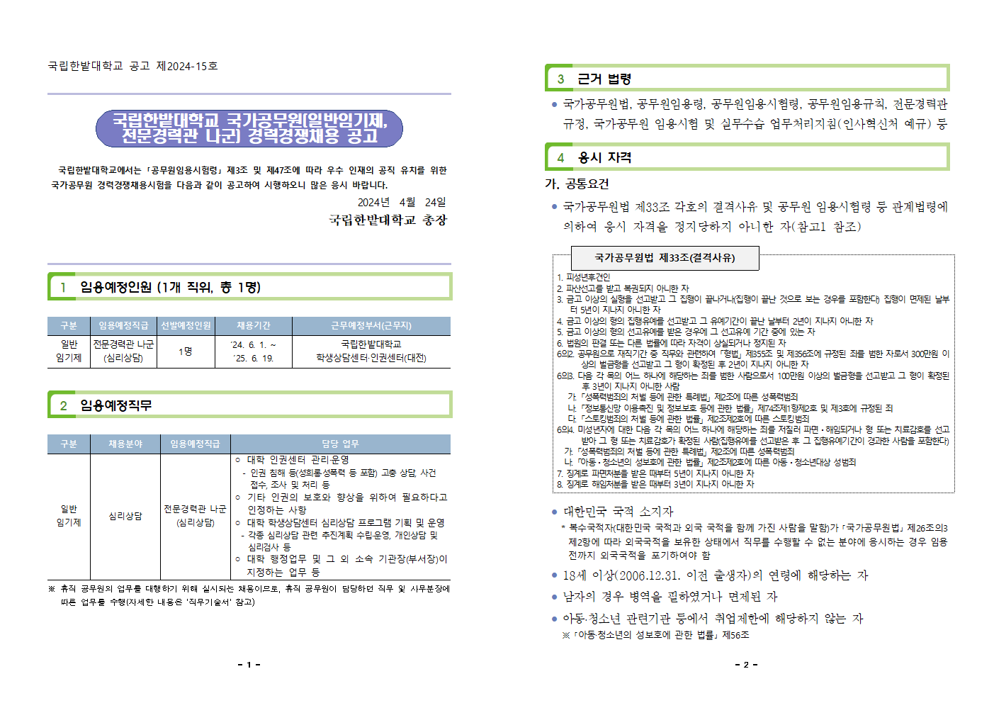 국립한밭대학교 국가공무원(일반임기제, 전문경력관 나군(심리상담)) 경력경쟁채용 공고문.hwp