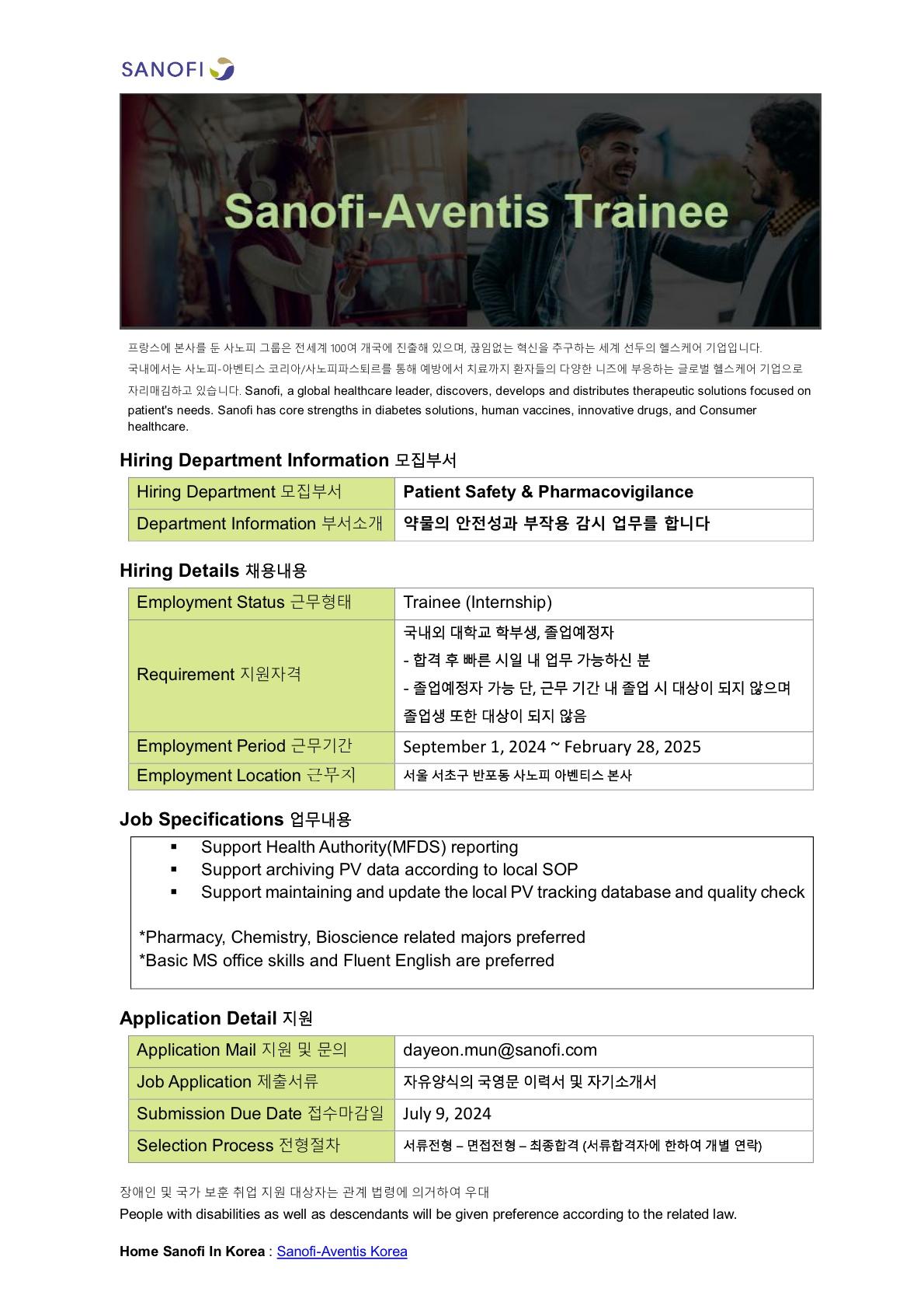 [Sanofi/사노피] Patient Safety & Pharmacovigilance 인턴 공고