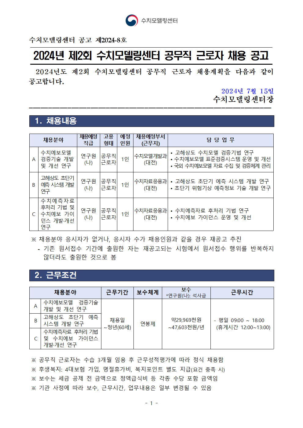 2024년도 제2회 수치모델링센터 공무직 근로자 채용 공고(제2024-8호).hwp