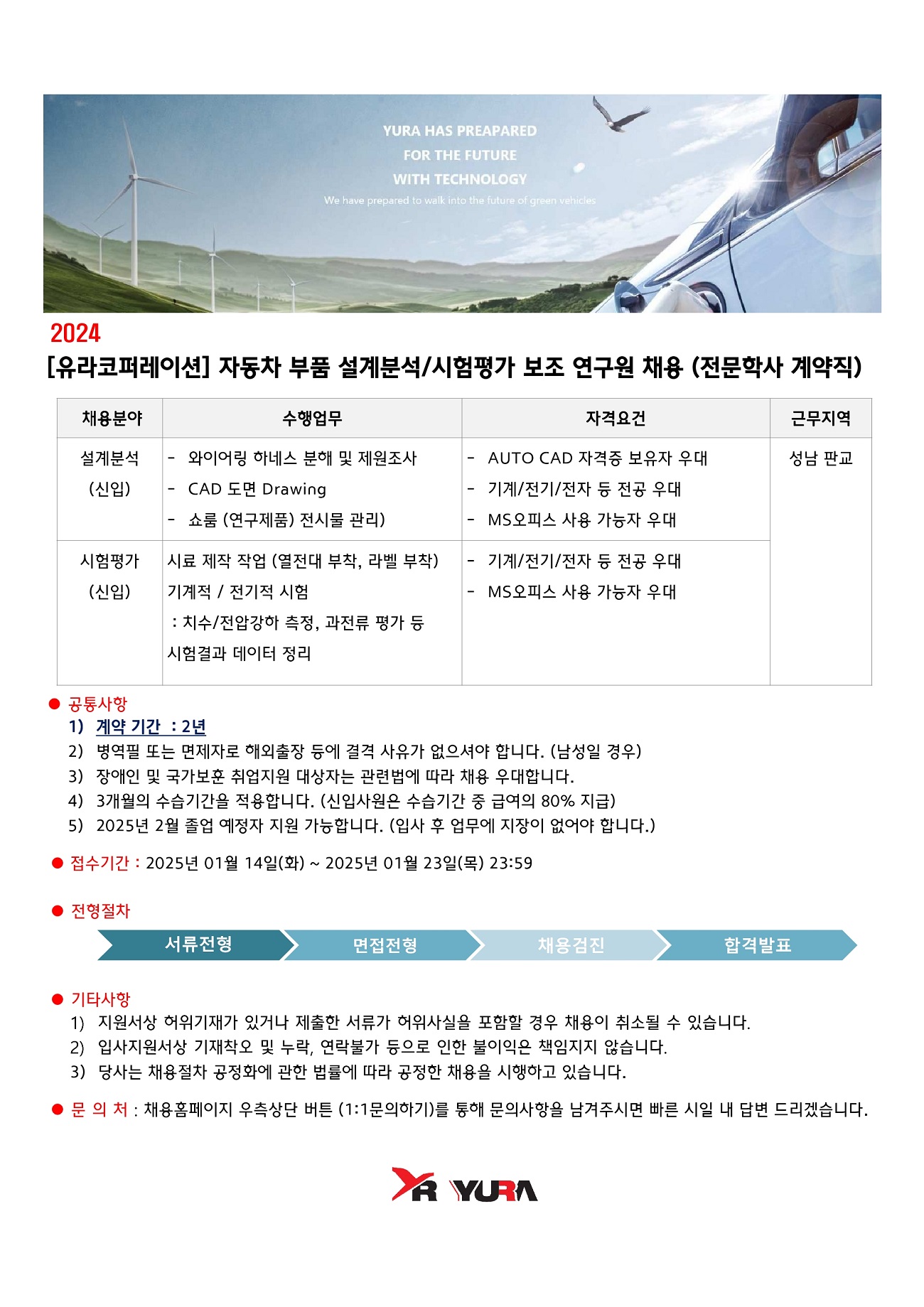 [유라코퍼레이션] 자동차 부품 설계분석 / 시험평가 보조 연구원 채용 (전문학사 계약직)