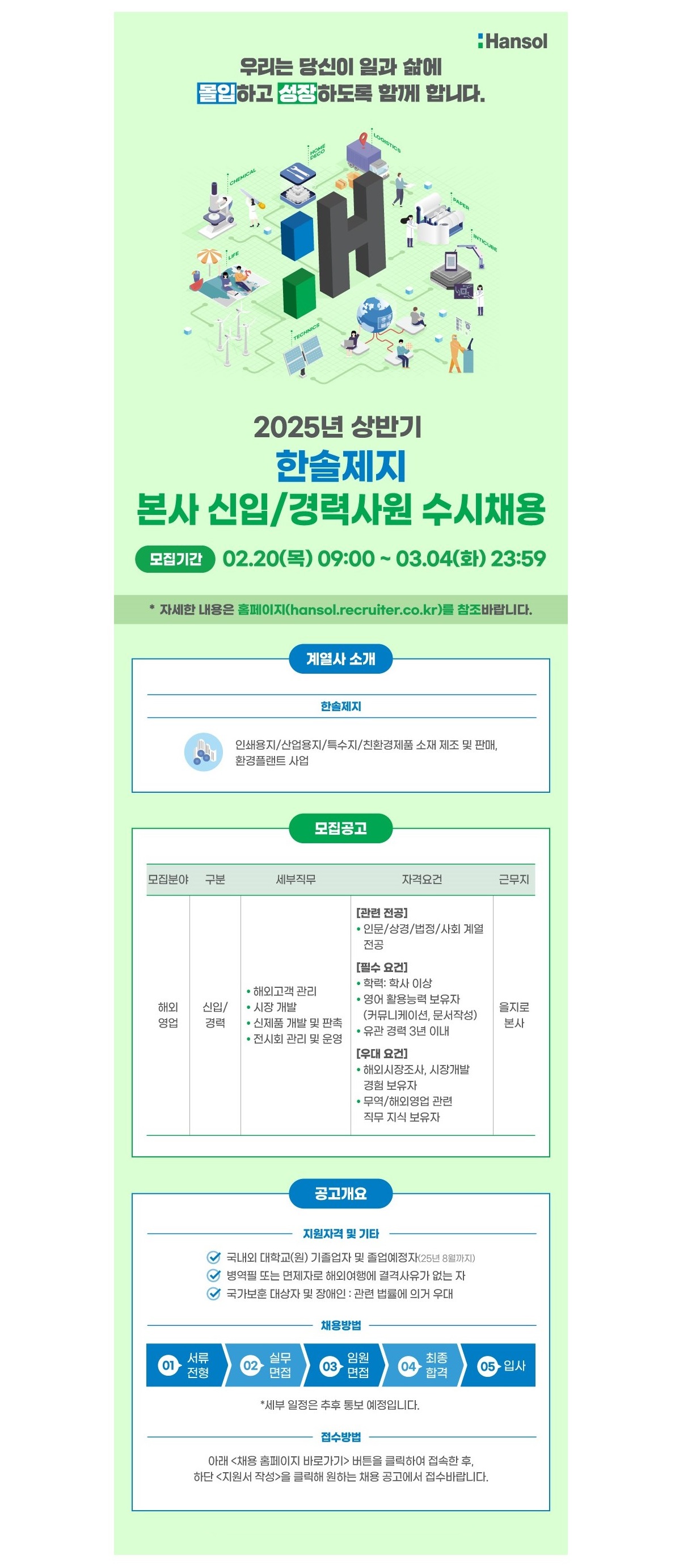 [한솔제지] 2025년 상반기 본사 신입/경력사원 수시채용