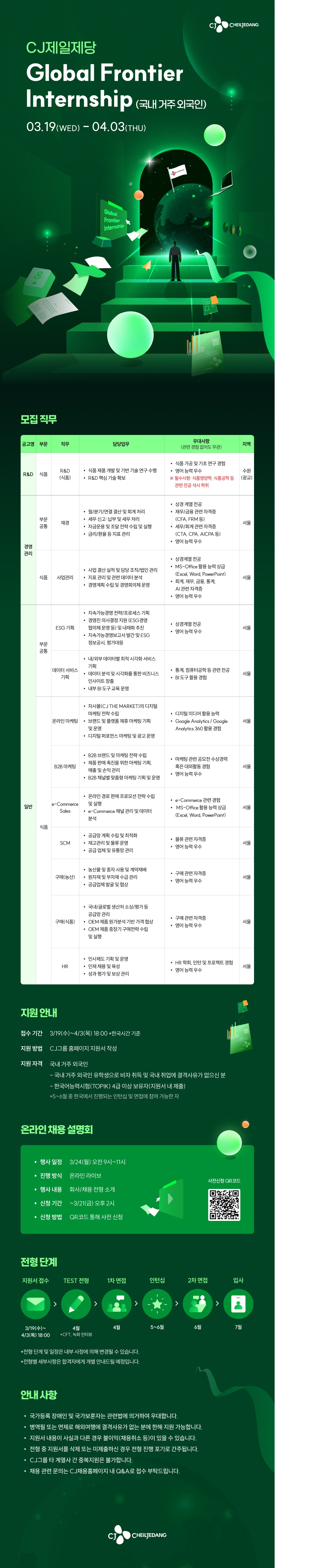 CJ제일제당 Global Frontier Internship (국내거주외국인) 채용 및 직무와 관련된 궁금한 점을 무엇이든 물어보세요!