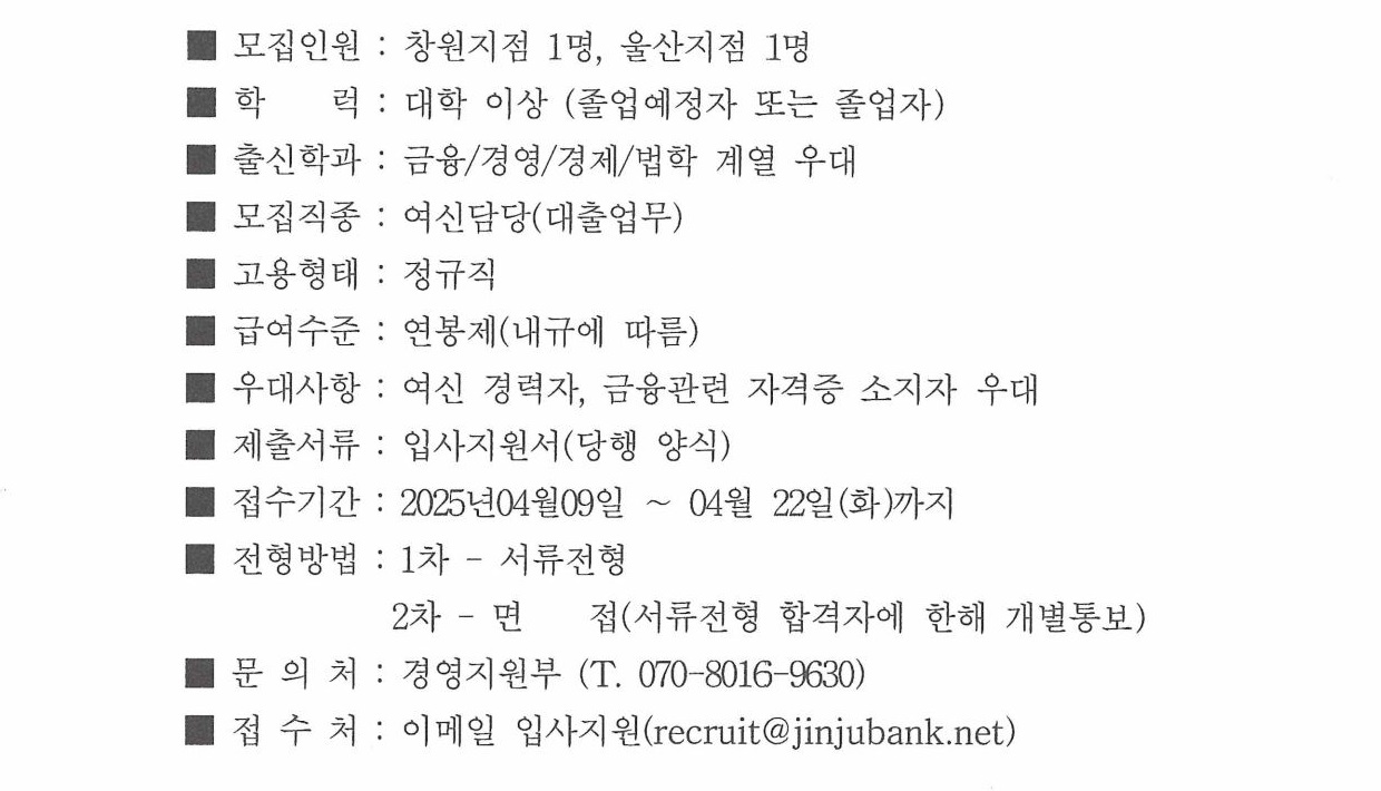 [진주저축은행] 창원, 울산지점 여신담당 채용