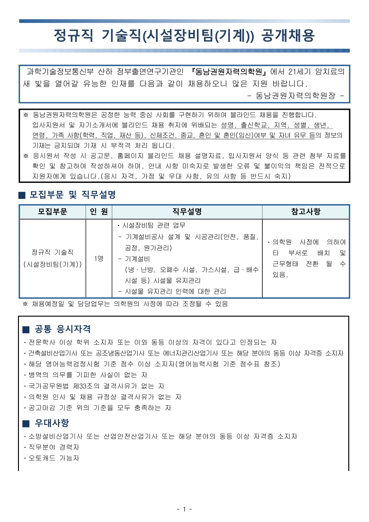 [동남권원자력의학원] 정규직 기술직(시설장비팀(기계)) 공개채용