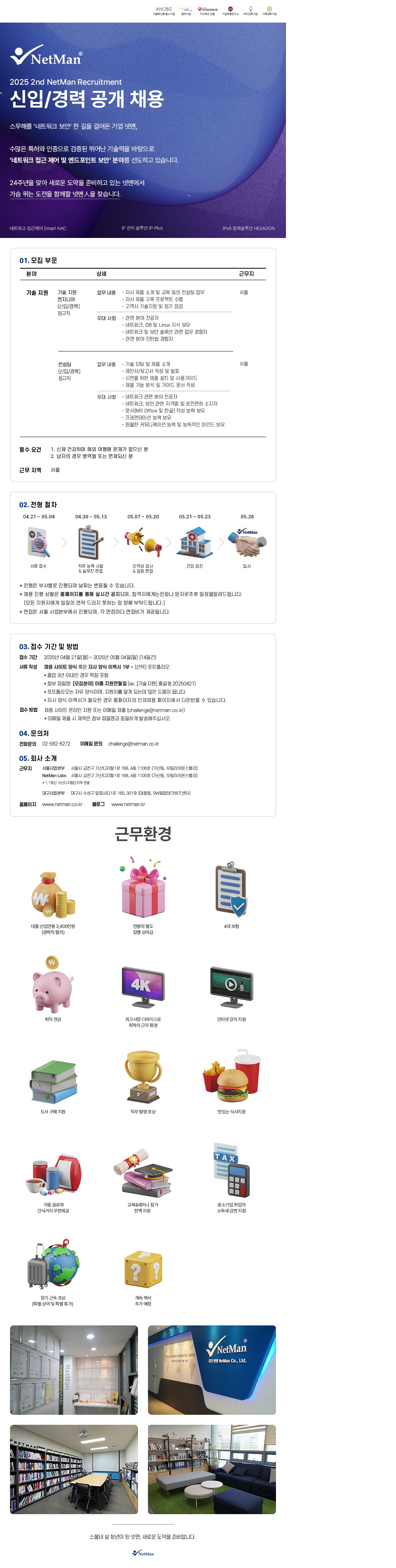 - 접수 방법 : 채용 사이트(사람인, 잡코리아) 즉시지원 : 자사 양식 입사지원서 작성 후, 이메일(challenge@netman.co.kr) 제출 - 근무지 : 서울 금천구 가산디지털1로 168, A동 1106호 ㈜넷맨 (서울 지하철 1,7호선 가산디지털단지역) : 대구 수성구 알파시티1로 160, 301호 (대흥동, SW융합테크비즈센터) * 상세 사항은 첨부의 모집 공고 참고 부탁 드립니다.