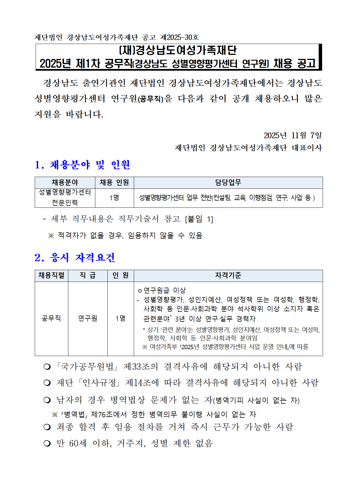 (2025-30호)(재)경남여성가족재단 2025년 제1차 공무직(경남 성별영향평가센터 연구원) 채용 공고문.hwp