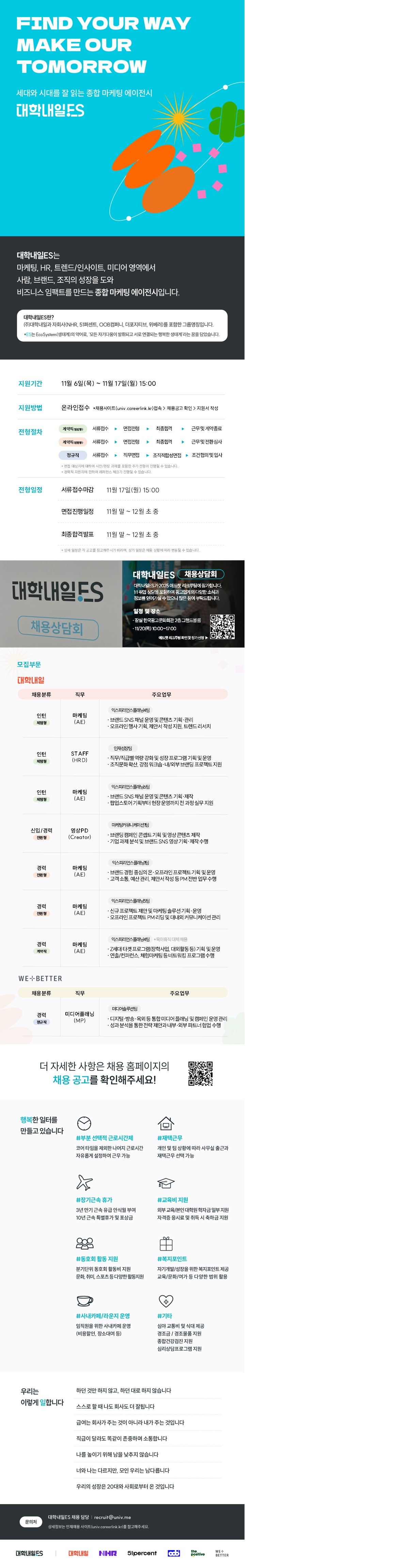 대학내일ES 채용공고 보러가기 : https://univ.careerlink.kr/인턴 프로그램 및 동호회 등 대학내일ES 회사생활이 궁금하다면? https://litt.ly/unives