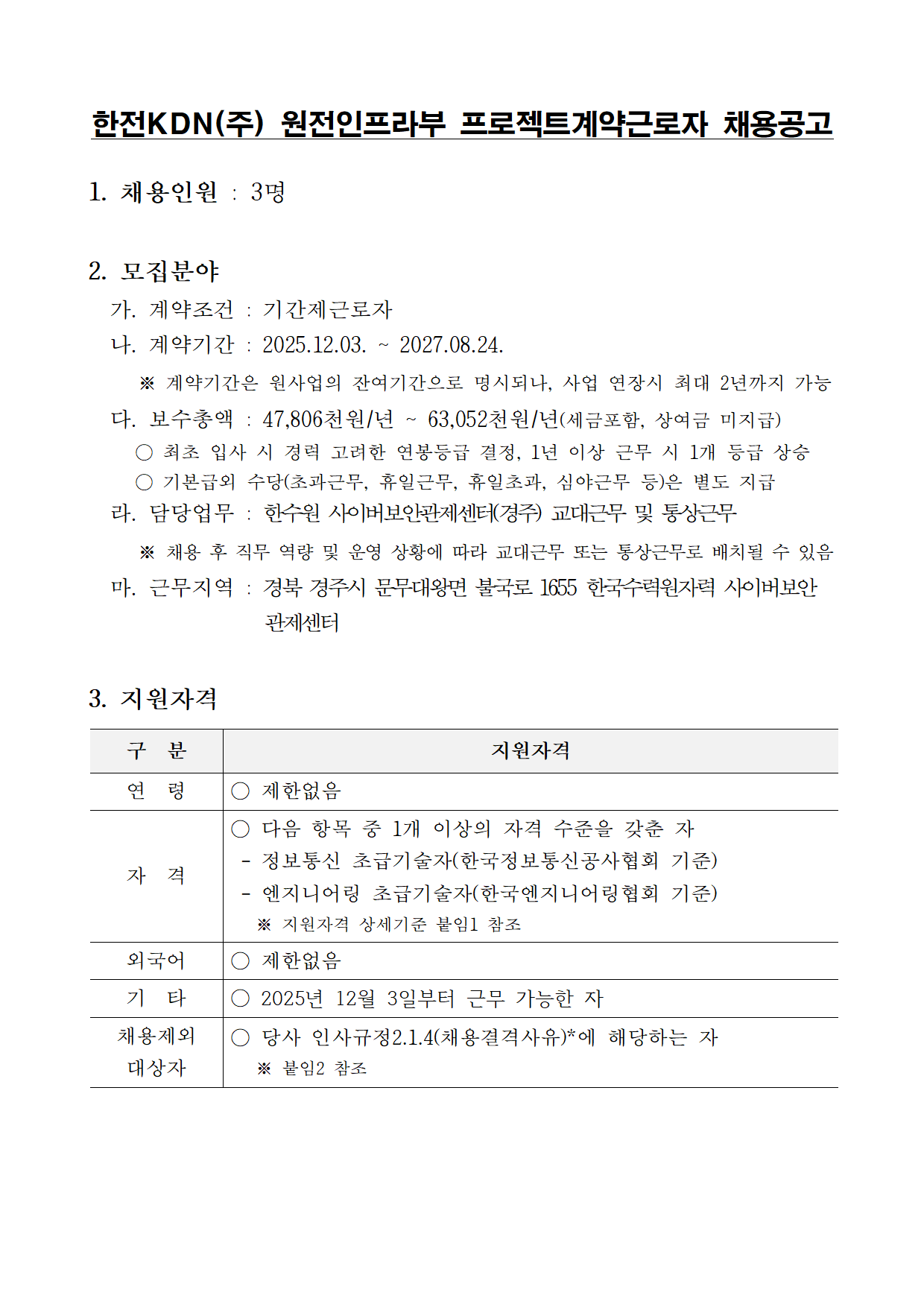 [한전KDN(주)] 원전인프라부 프로젝트계약근로자 채용공고