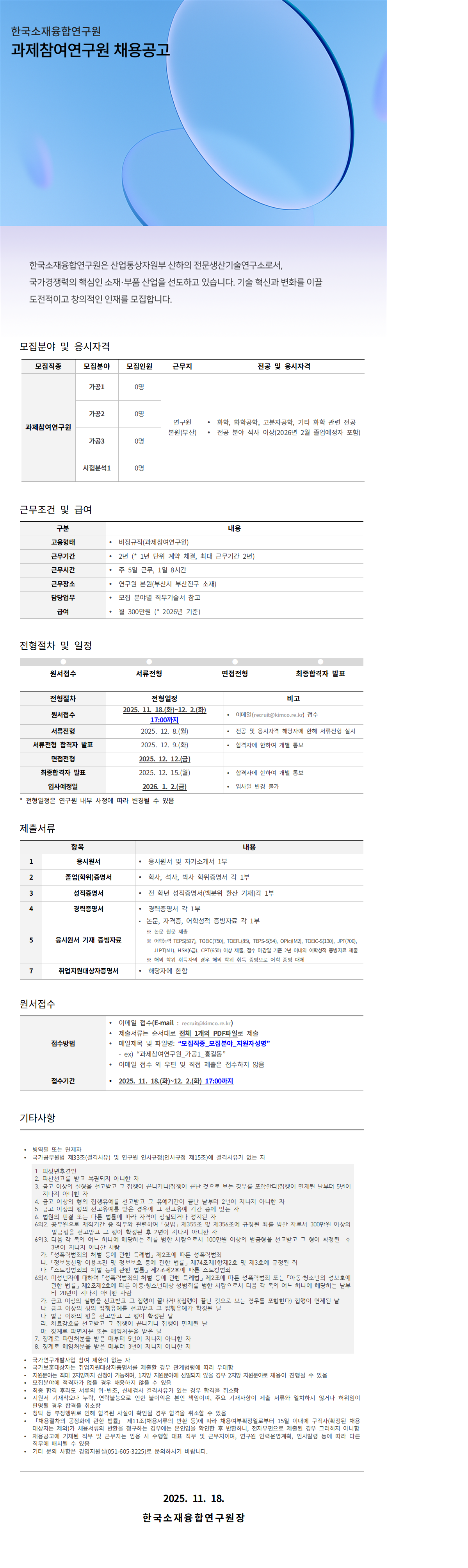 [한국소재융합연구원] 과제참여연구원 채용공고