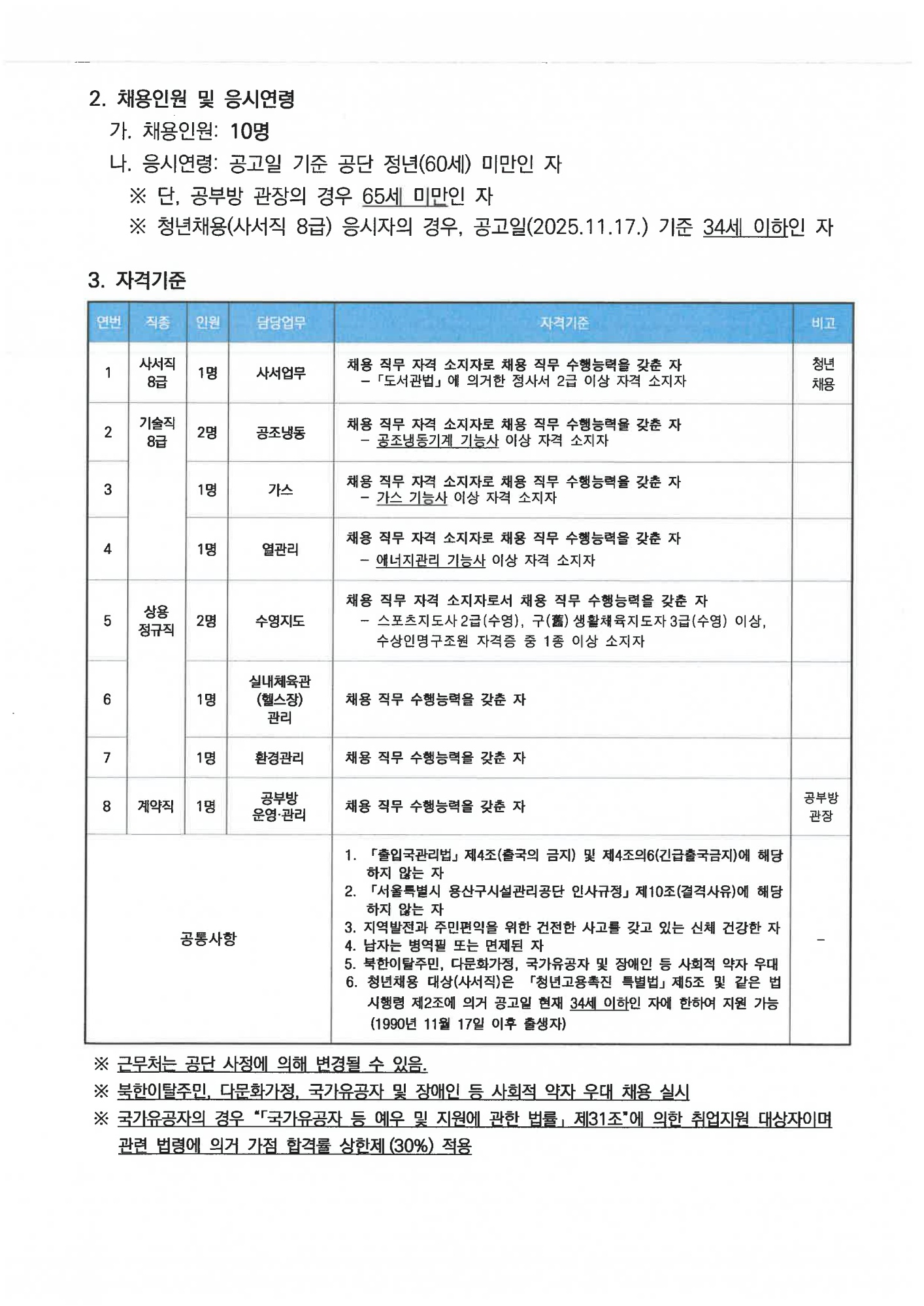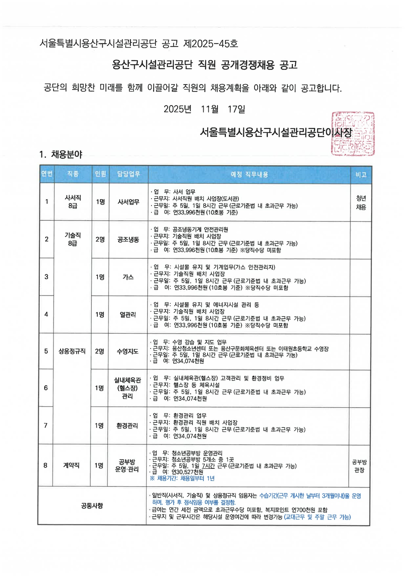 [용산구시설관리공단] 2025년 제7회 직원 공개경쟁채용 공고