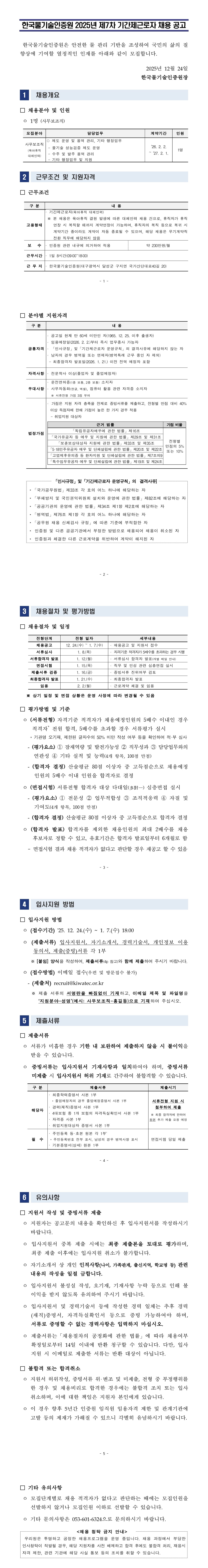 [한국물기술인증원] 2025년 제7차 기간제근로자 채용 안내