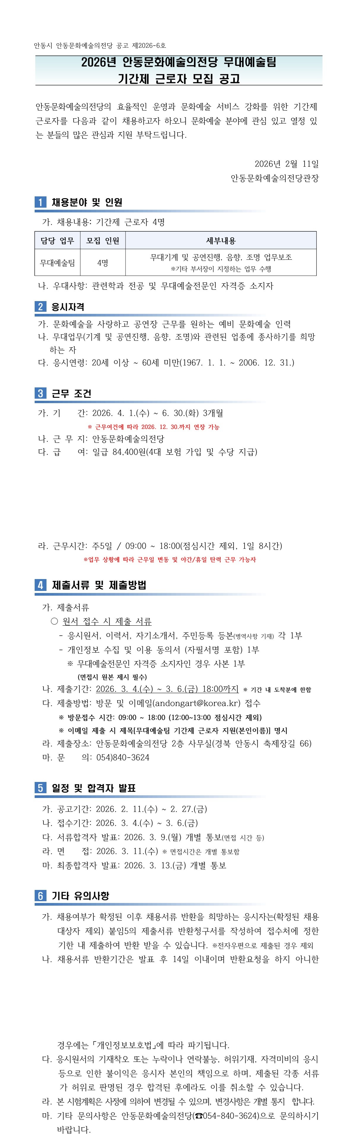 [안동문화예술의전당] 2026년 무대예술팀 기간제 근로자 모집 공고